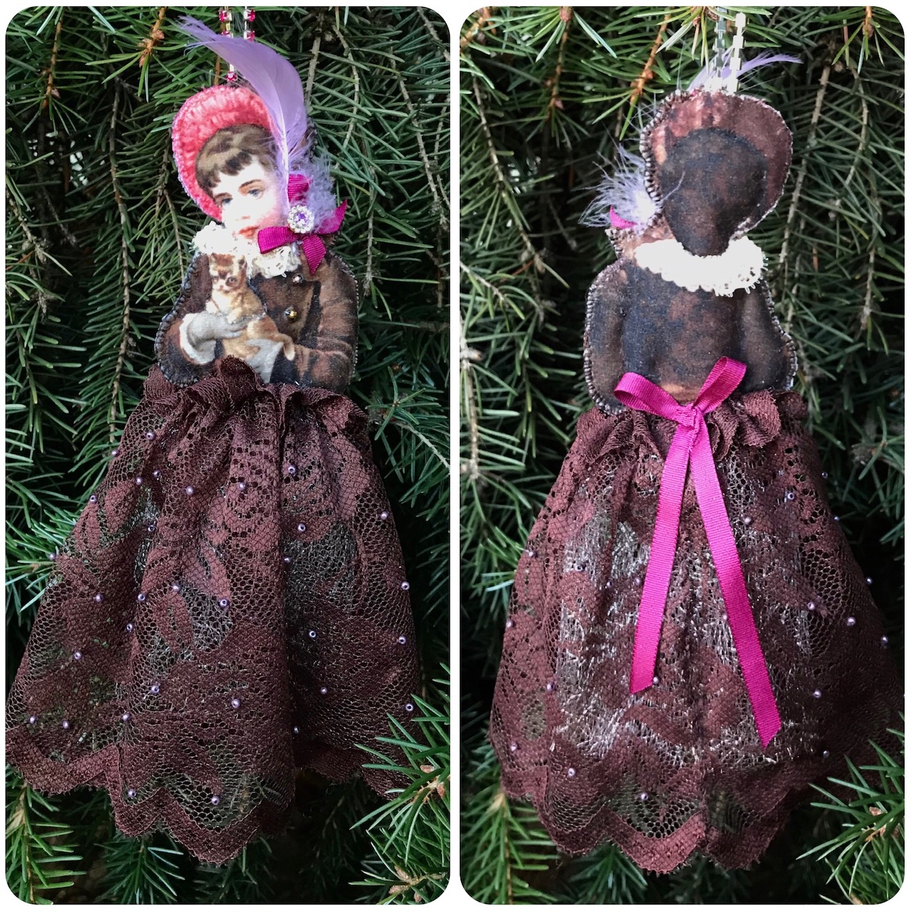Вырезала две стороны куколки. Материал очень приятный, бархатный. На место напечатанного кружева, я пришила настоящее. Из бусинок сделала пуговки.