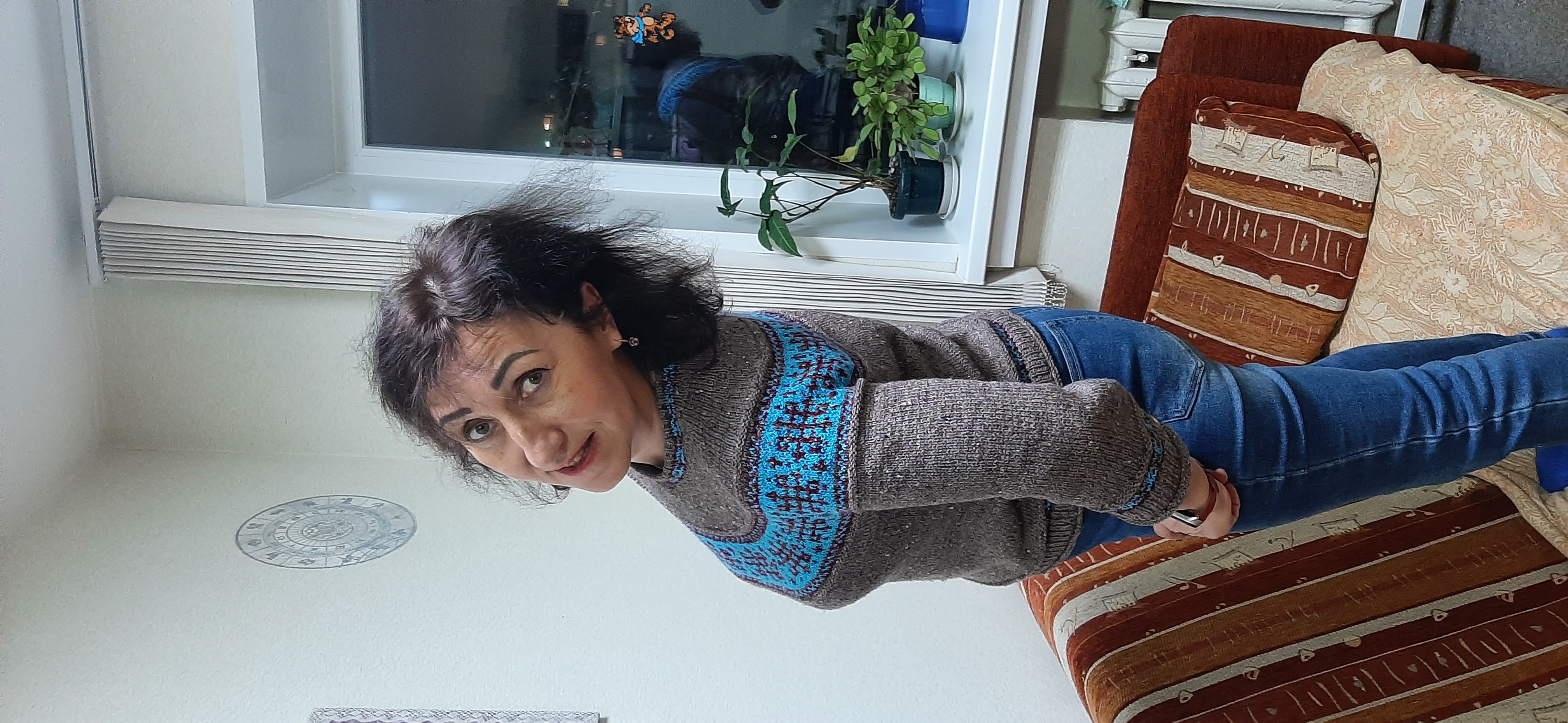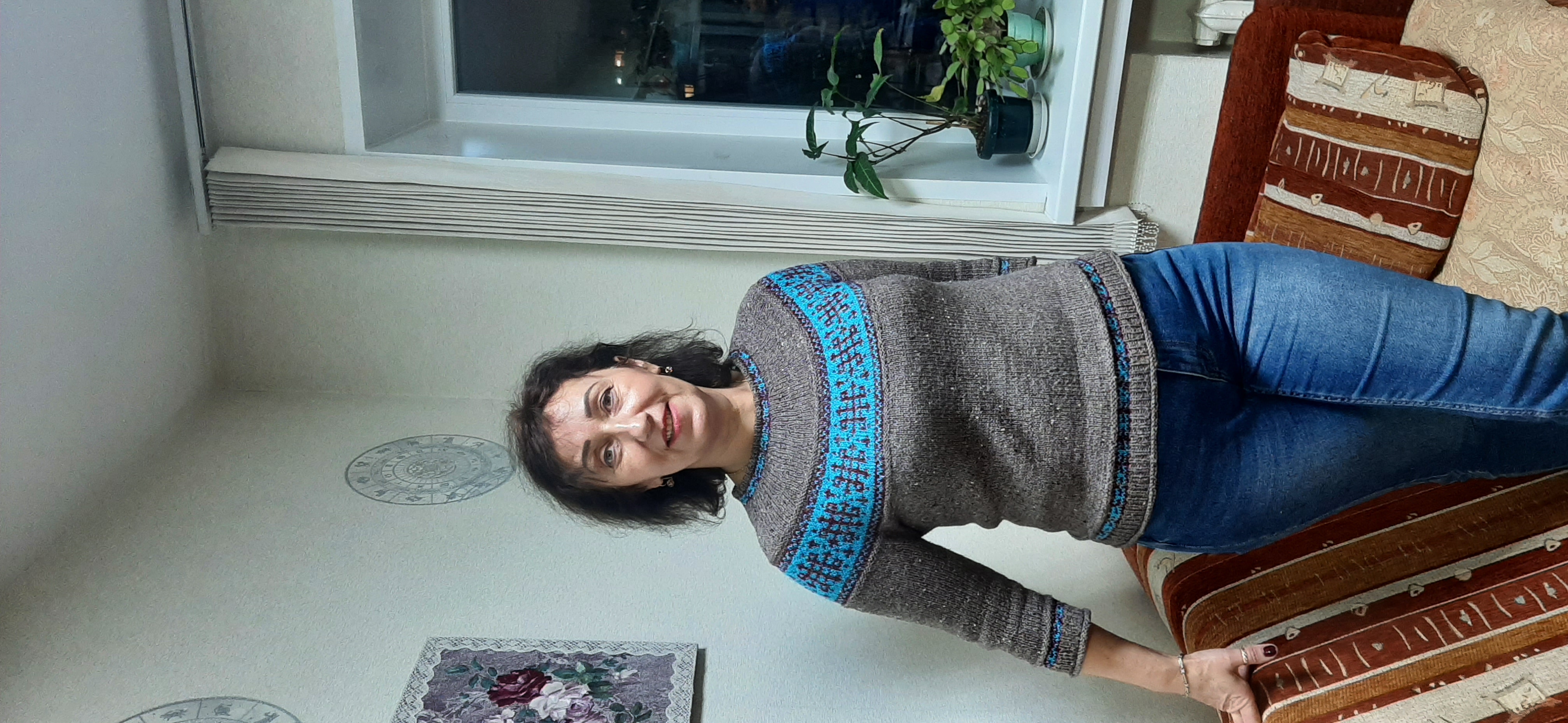 Здравствуйте дорогие рукодельницы! Вот дошли руки сделать фото и показать Вам мой свитер, связанный по мотивам Линки Нойман. Процесс вязания описан в книге Л Н, поэтому расписывать его не буду, но уточню, что вязала свитер сверху, из ниточек Ализе, которые просто были дома в наличии; на жакардовый узор тоже пошли ниточки, что были дома. Рукава короткие потому, что ниток уже не хватало. Свитерок получился симпатичный, мне нравиться, тоненький, очень приятный. Фото делали на работе, т ч извините за качество))). Поздравляю Всех с наступившим Новым годом и Рождеством!!!, всех благ и радости от любимого творчества!!!