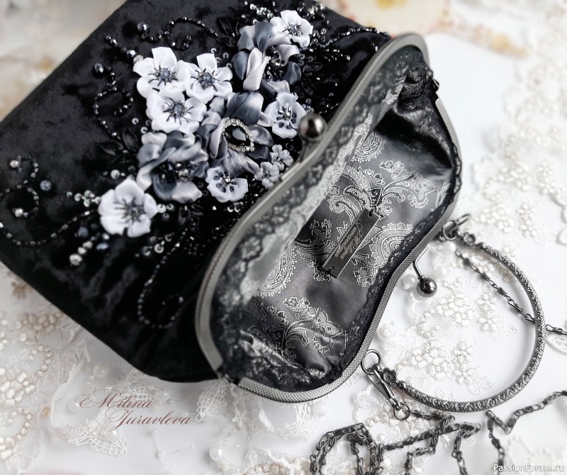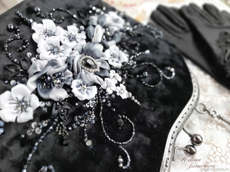 Отличная композиция, удачный монохром, работа качественная, вам к лицу сумочка. Сама я тоже пробовала вышивать лентами, но как-то не зацепило, равнодушна к ним.