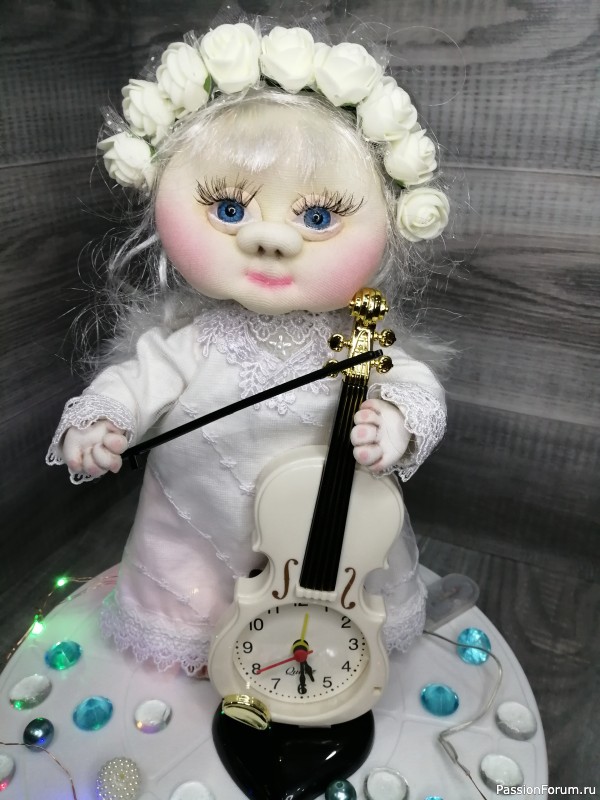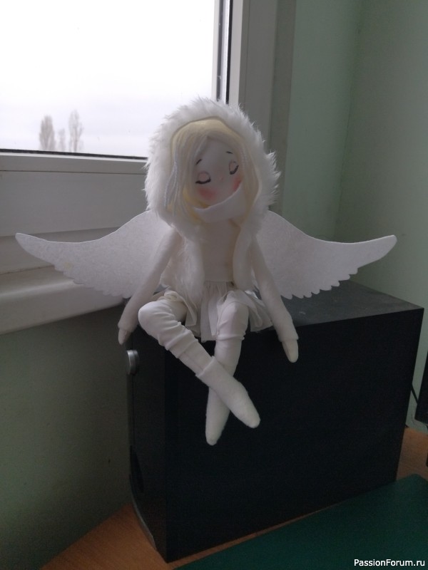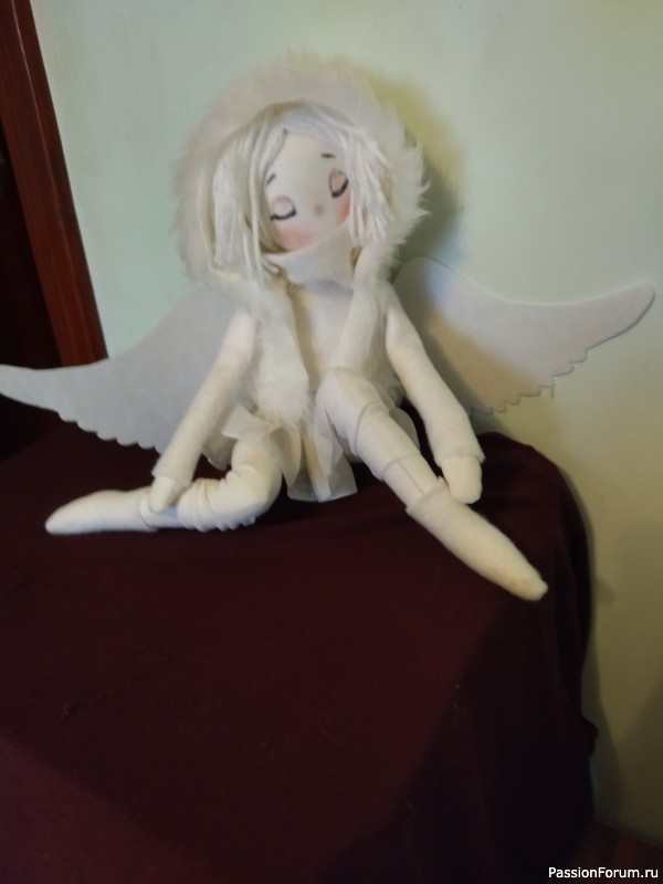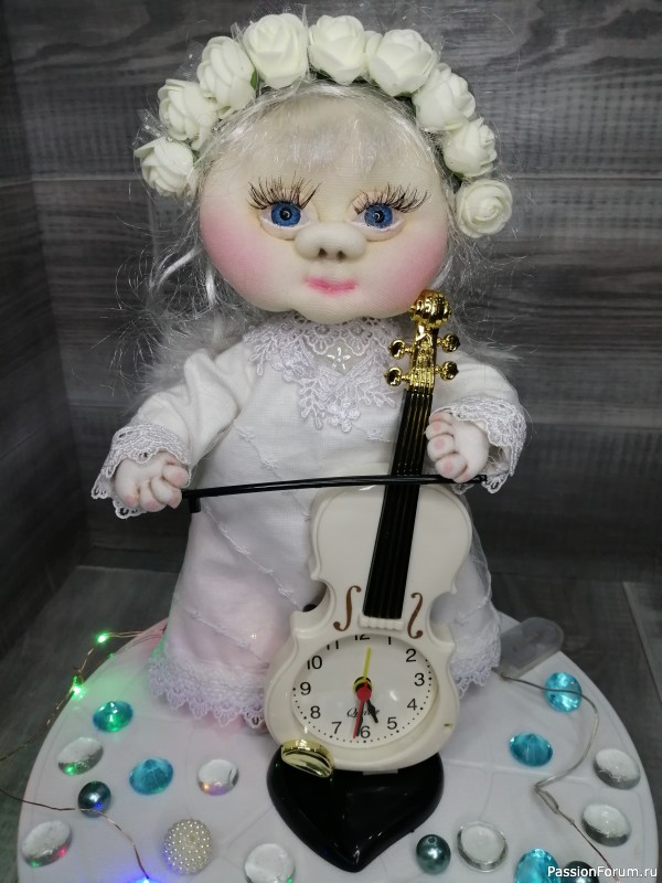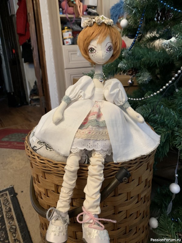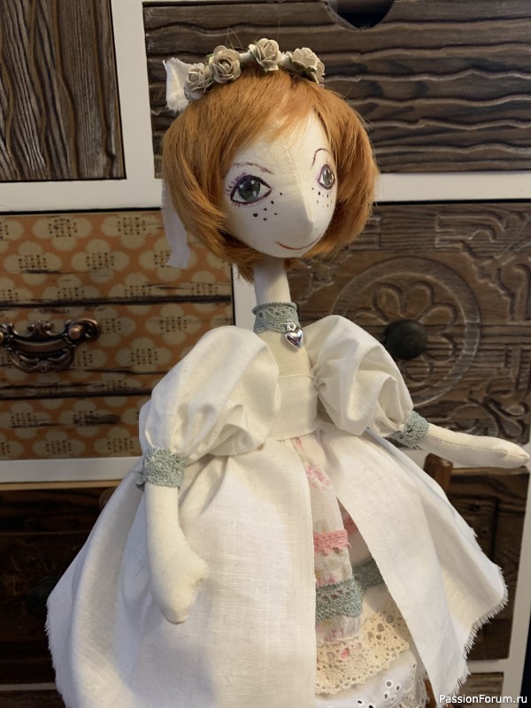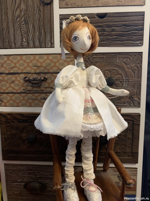 Знакомьтесь. Она высокая 40 см, внутри проволочный каркас, хорошо стоит и красиво сидит. Выкройка взята у Войнатовской Елены.Шила уже не одну куколку по этой выкройке и очень нравиться.