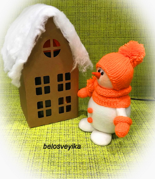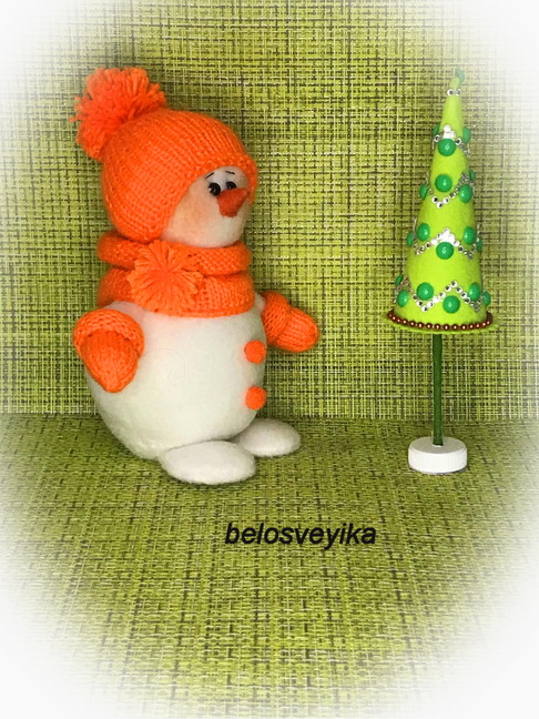 В один из вечеров нашла в инете как шить их фетра миниатюры Нашила разные фетровые мороженные.Теперь даю в руку снеговикам по мороженному. Оранжевый декор связала сама.