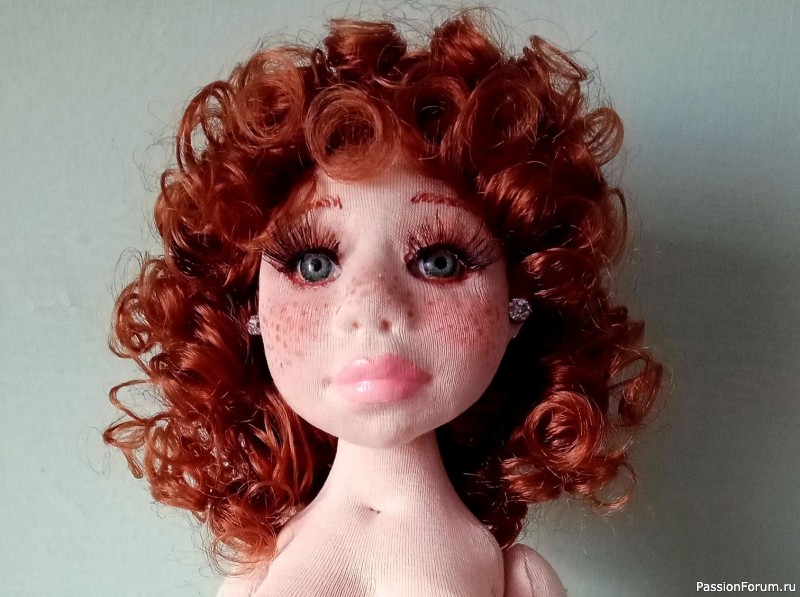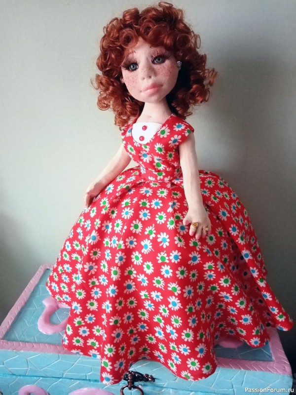 Высота 40 см. Сделала уже в этом году в технике скульптурного текстиля, но немного технически по-другому без использования утяжек. Есть у меня претензии к кукле, пока ещё не удаётся мне создать по настоящему красивое лицо, да и руки на этот раз не очень получились, придётся вернуться к старому проверенному способу изготовления рук. Чехол для грелки созборила, перекраивать не хотелось. Платье сшила из штапеля, но настоятельно советую всем не шить из штапеля, замучаетесь, ткань нестабильная, выкраивать надо с большим запасом и подгонять надо уже на фигуре, кто решиться из штапеля шить, сразу поймёт в процессе. Трессы волос шила из локонов, а потом приклеила пистолетом. Цвет волос натурально рыжий, очень трудно фотографировать, на фото получается излишне красным. Я конечно старалась повыгоднее фотографировать, но у моей Пеппи получился очень тяжёлый взгляд, от которого кровь в жилах стынет, будто в неё вселилась недобрая сущность - сама боюсь своей куклы, поэтому плохие фотки удалила. А почему так вышло, думаю, что в торопях забыла свалять нижние веки, либо зрачки сильно сфокусировала, раньше-то я делала немного расфокусированный взгляд и лица получались добрее.