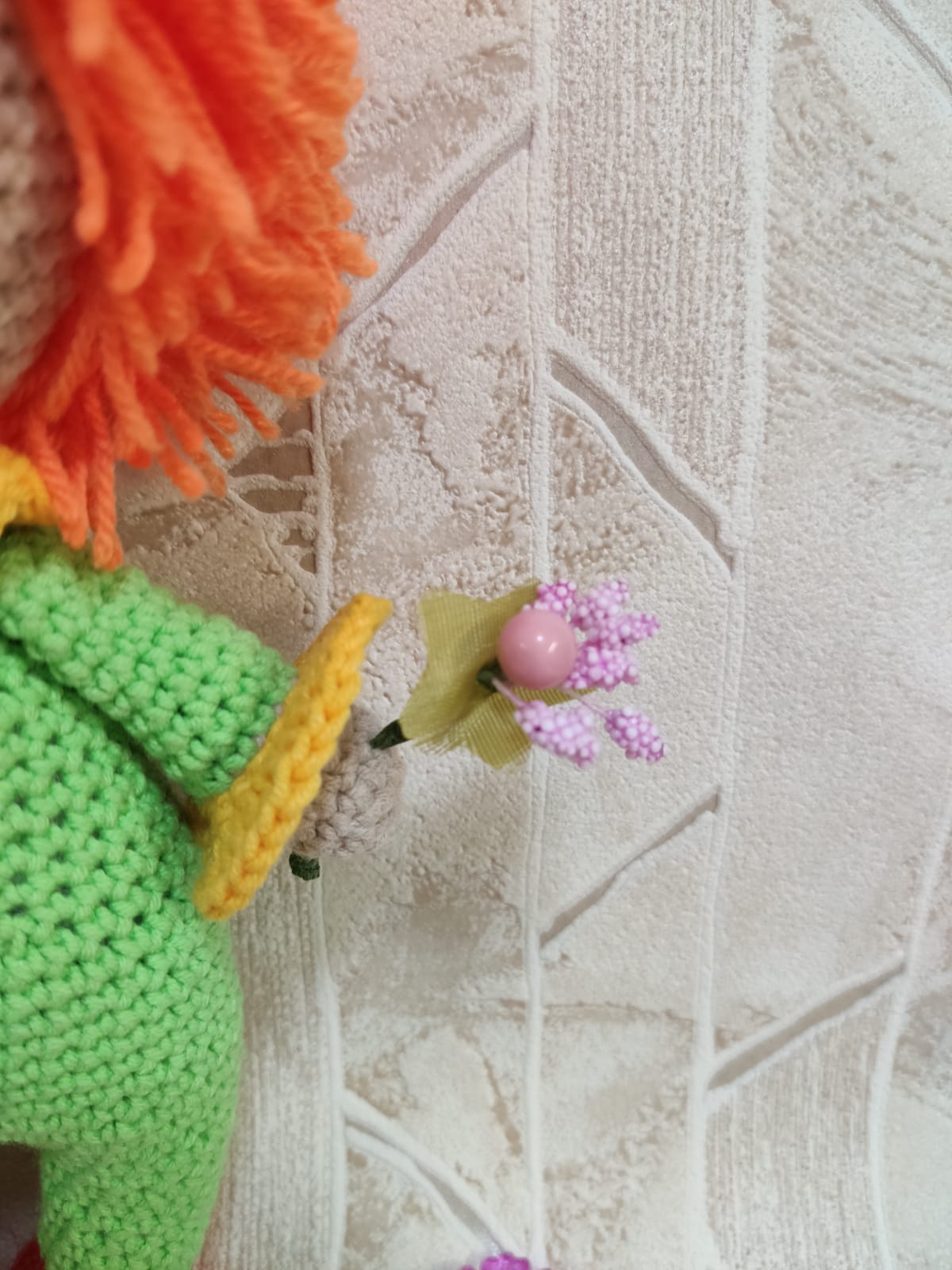 Помпончики покупные, я их приклеили клеем друг к другу, потом к телу приклеила и пришила.