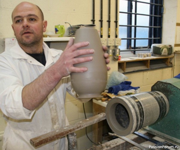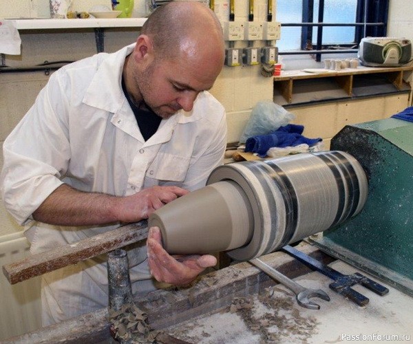 На следующий день глиняная форма вручную обтачивается на токарном станке, чтобы устранить боковые выступы и излишки глины.