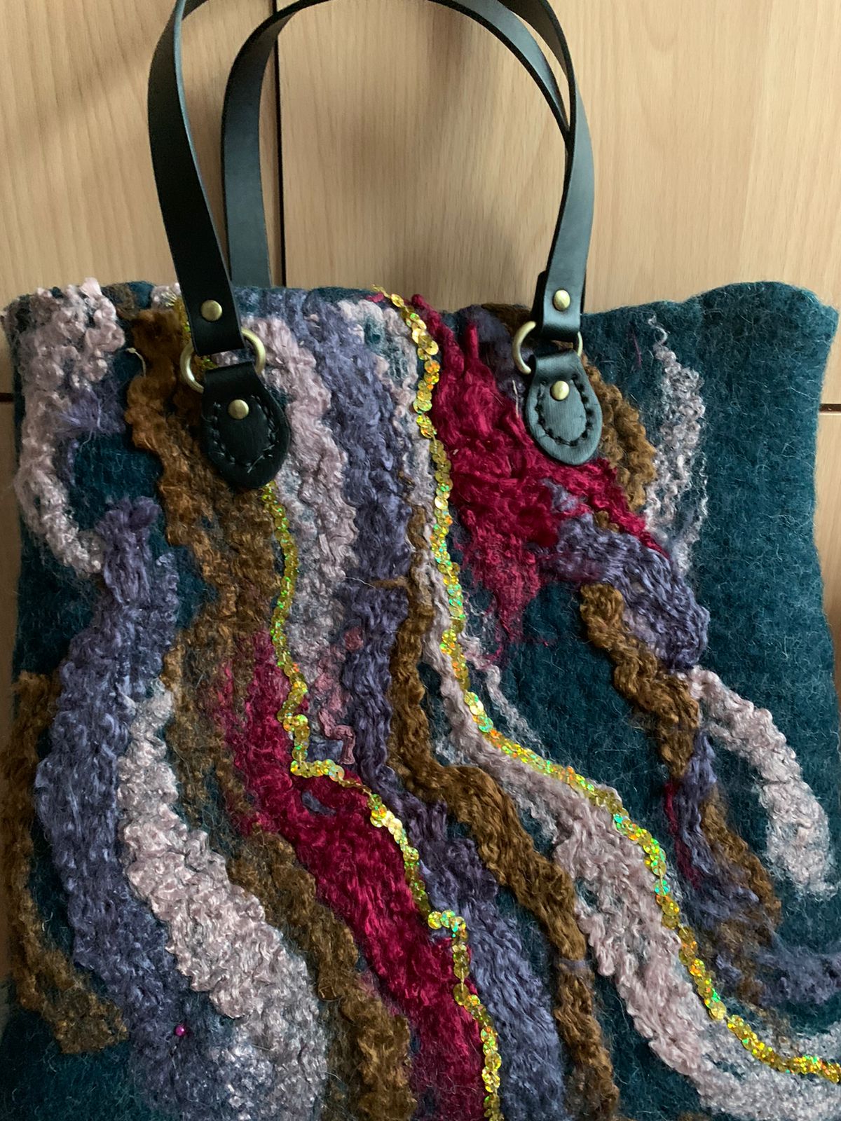 форму сумок люблю такую -пакетную. летом таскаю свою не доваляную. а тут решила и зимний вариант сделать.( уже доваляную!) не обошлось конечно без ошибок, но на них и учимся... Хотела удешевить изделие. поэтому на первый внутренний слой взяла белую деревенскую шерсть( дешёвую) а сверху положила кардочёс бергшаф . между ними проложила хороший слой черной вискозы. сразу хочу сказать,не помогла... белая шерсть всё таки пробилась через бергшаф.... больше этого не повторю. и вискоза не вся привалялась, но с этим нужно ещё разбираться...