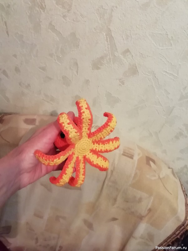 Осьминожек связан по бесплатному мк Ольги Федоренко. Пряжа YarnArt Jeans, высота игрушки 9 см, диаметр 14 см