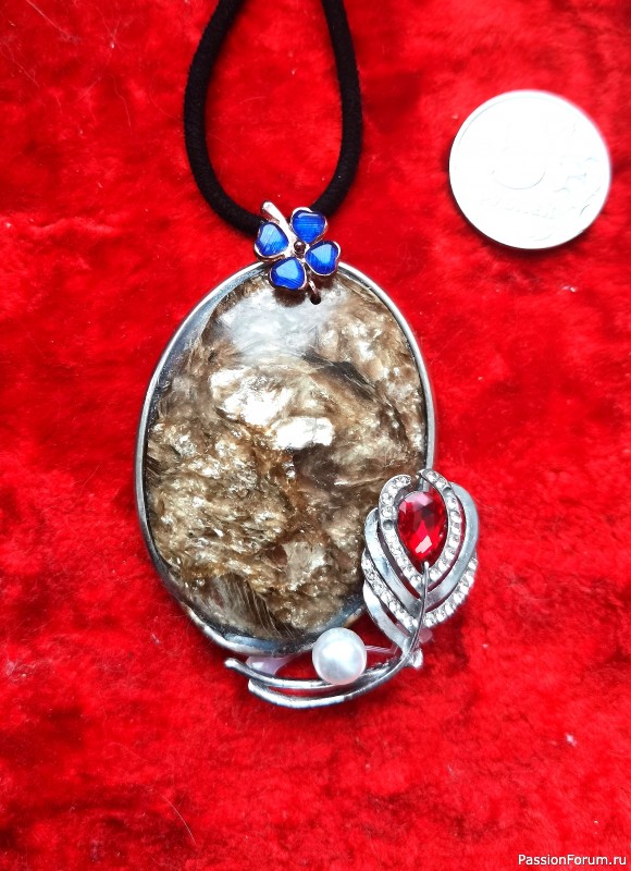 Кулон на основе кабошона слюдииа одетого в оправу из металла ювелирного сплава с элементом пера жар птицы, вставка-страз..