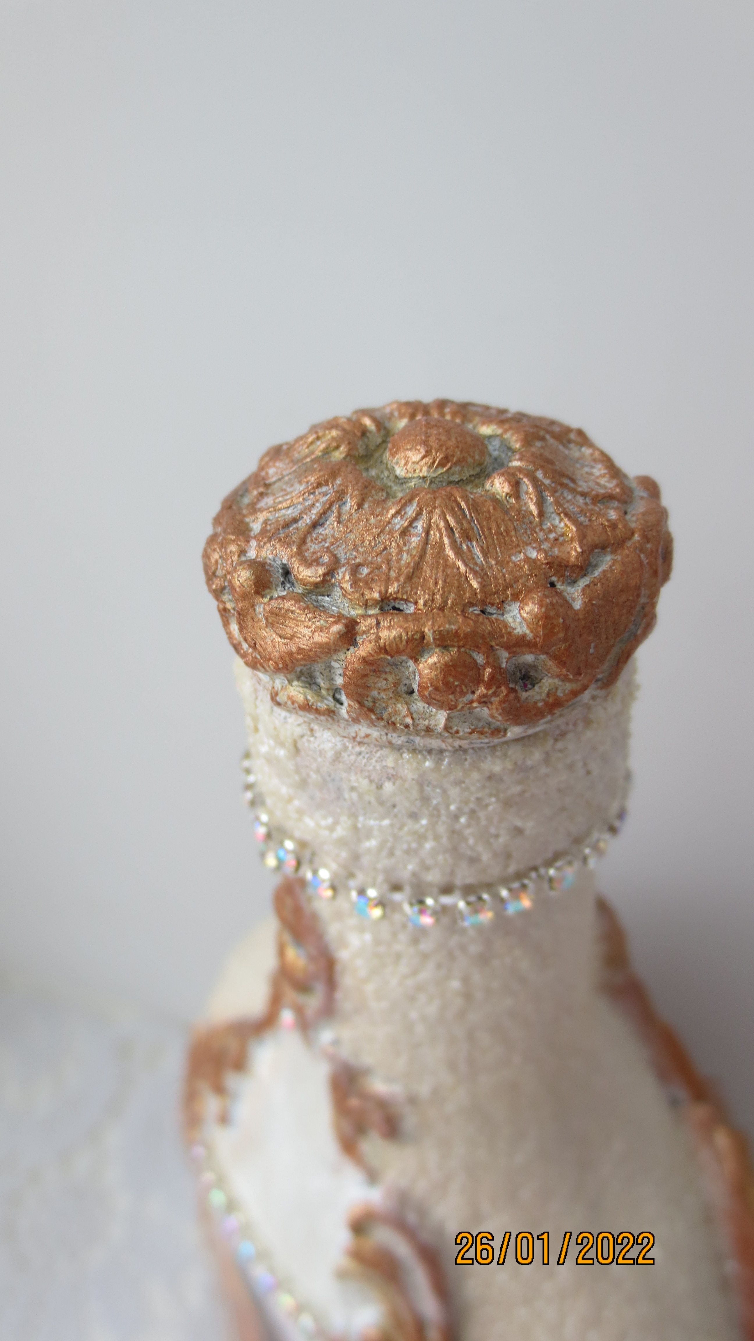 Интересный фон дала манка. Её насыпала или смешивала с краской? Спереди бутылочка очень нежная. А вот сзади тяжеловата на мой взгляд.