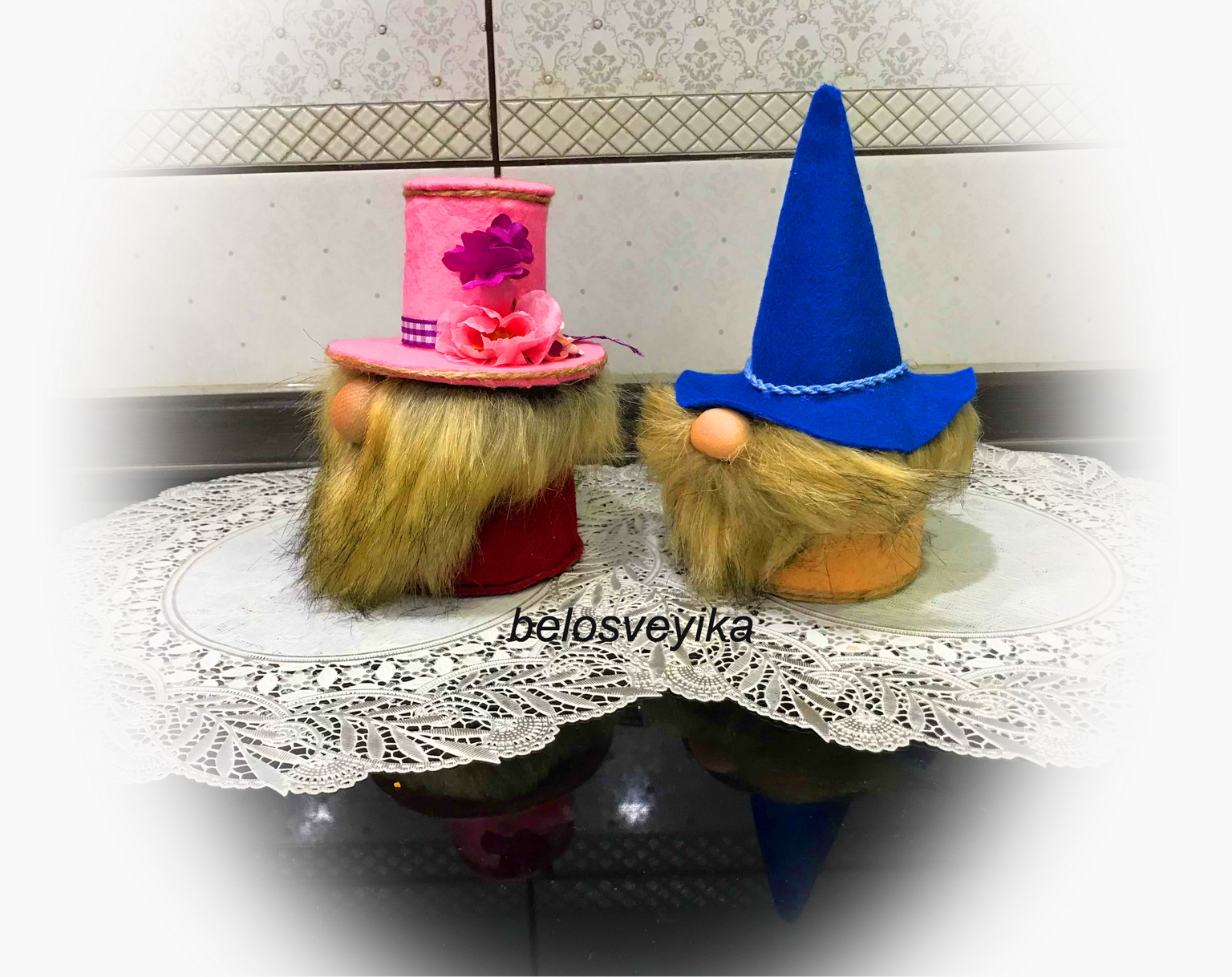 1) Я взяла для 1-го гнома (в шляпе цилиндре) фетр жесткий , толщиной 2мм.Жесткость не позволила сделать идеальным цилиндр При создании которого, на тулье, появились заломы И они видны Я конечно задекорировала цветами, но я их всё равно вижу.