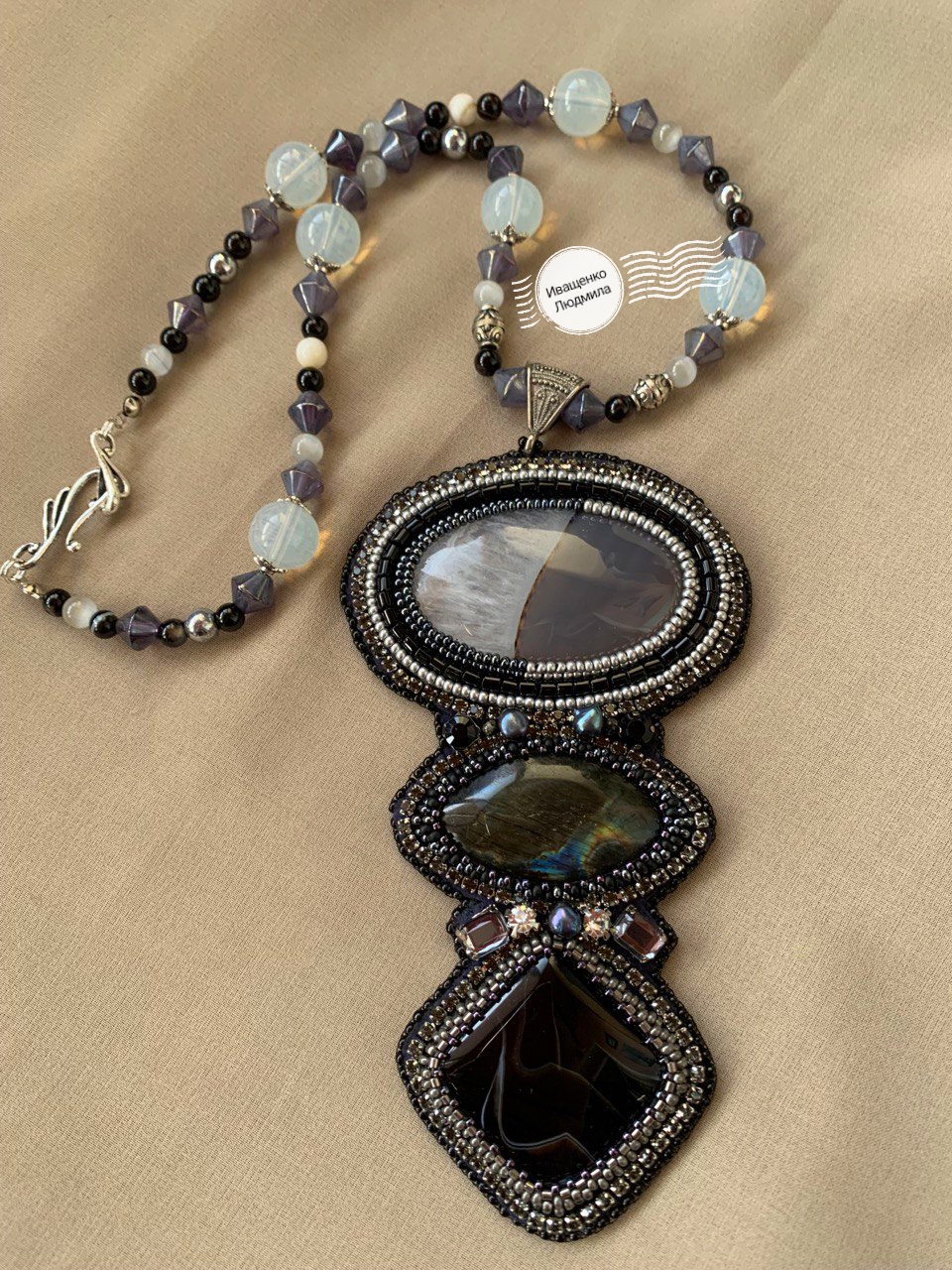 Украшение создано из прекрасных материалов и фурнитуры.Кабошоны двух видов агата,лабрадорита,жемчуга,стразовой цепочки и различных бусин лунного камня,кошачьего глаза,агата,перламутра,изнанка натуральная кожа.Вышивка японским и чешским бисером.Украсит любой образ и наряд.