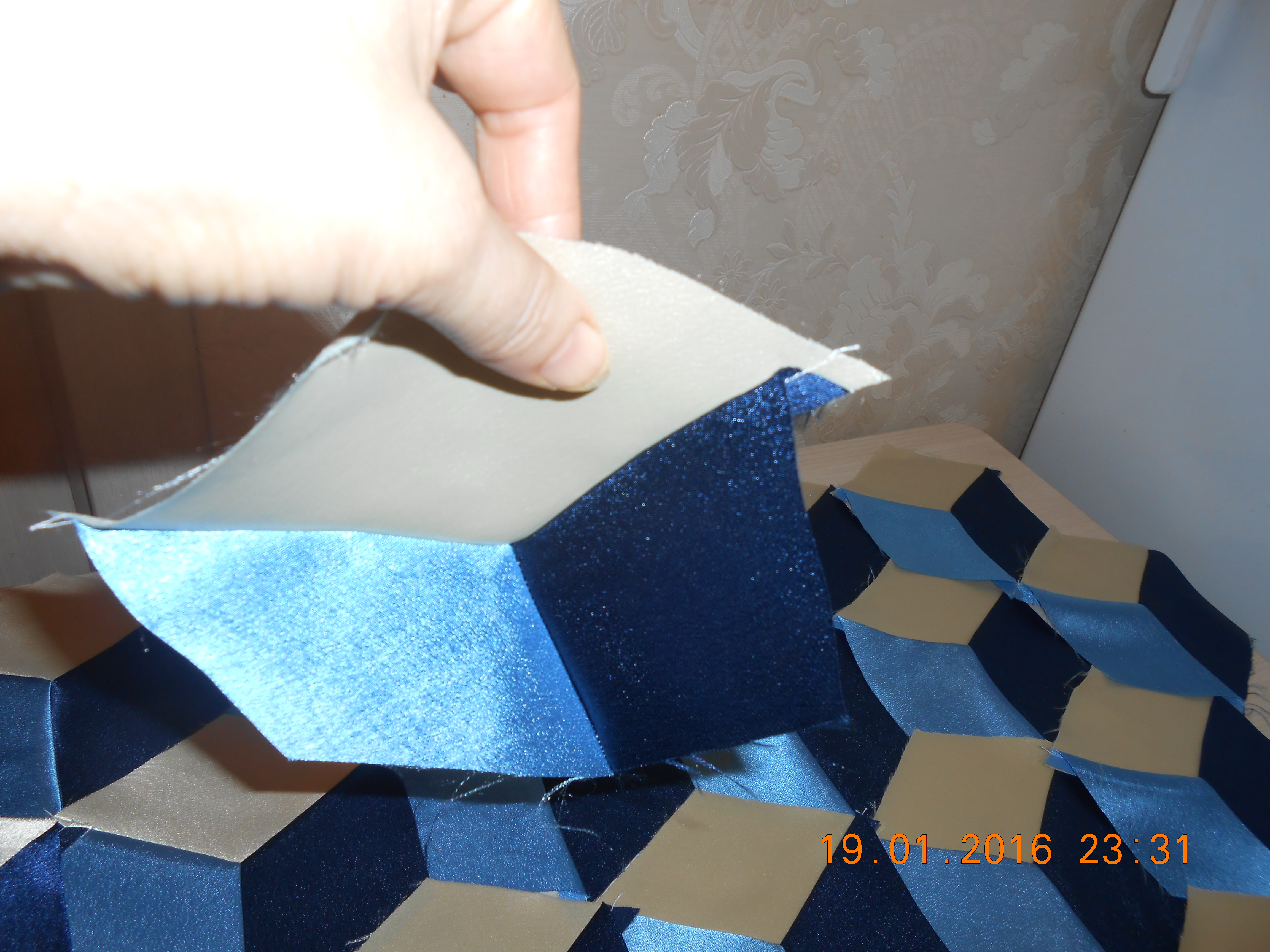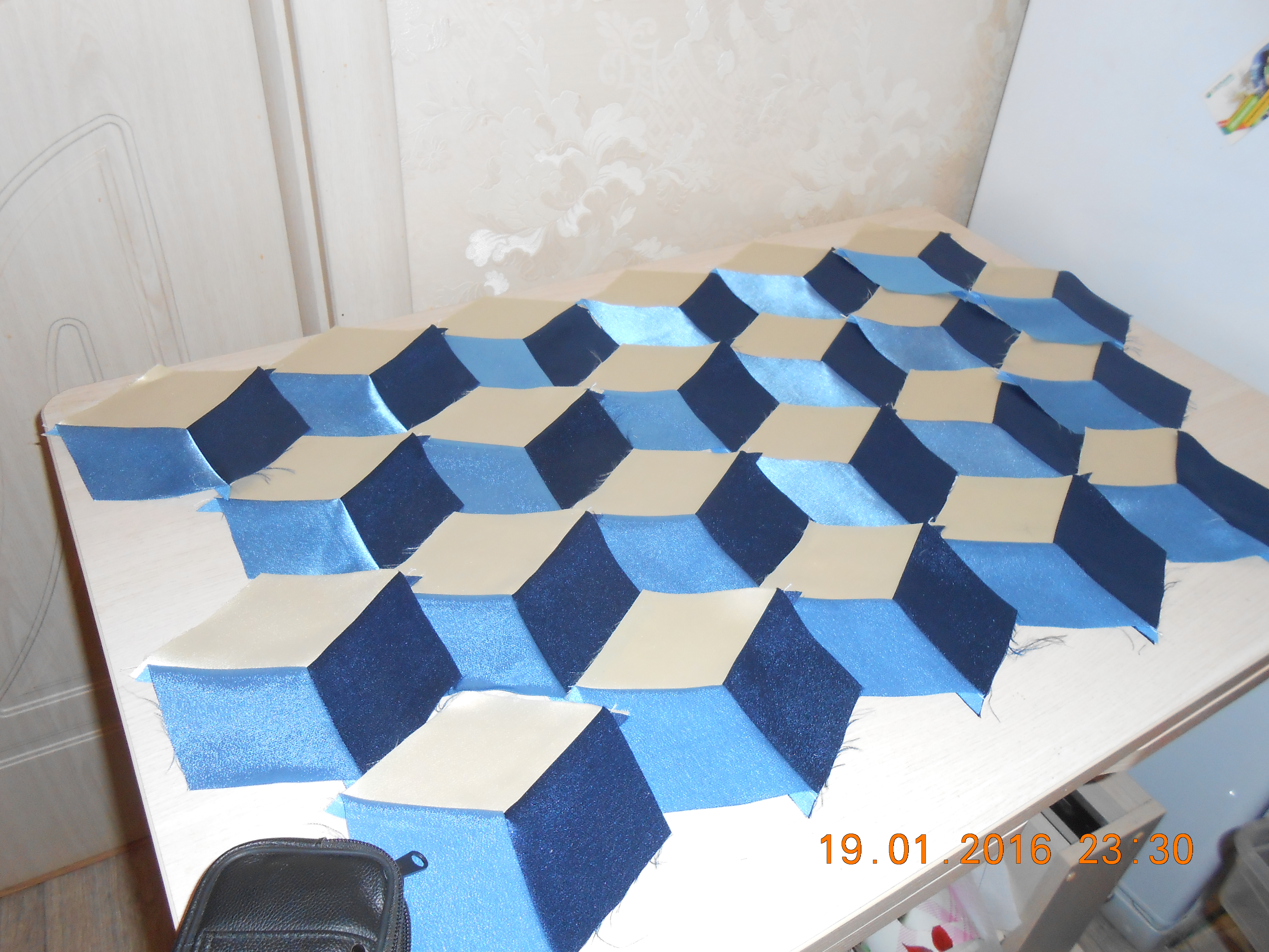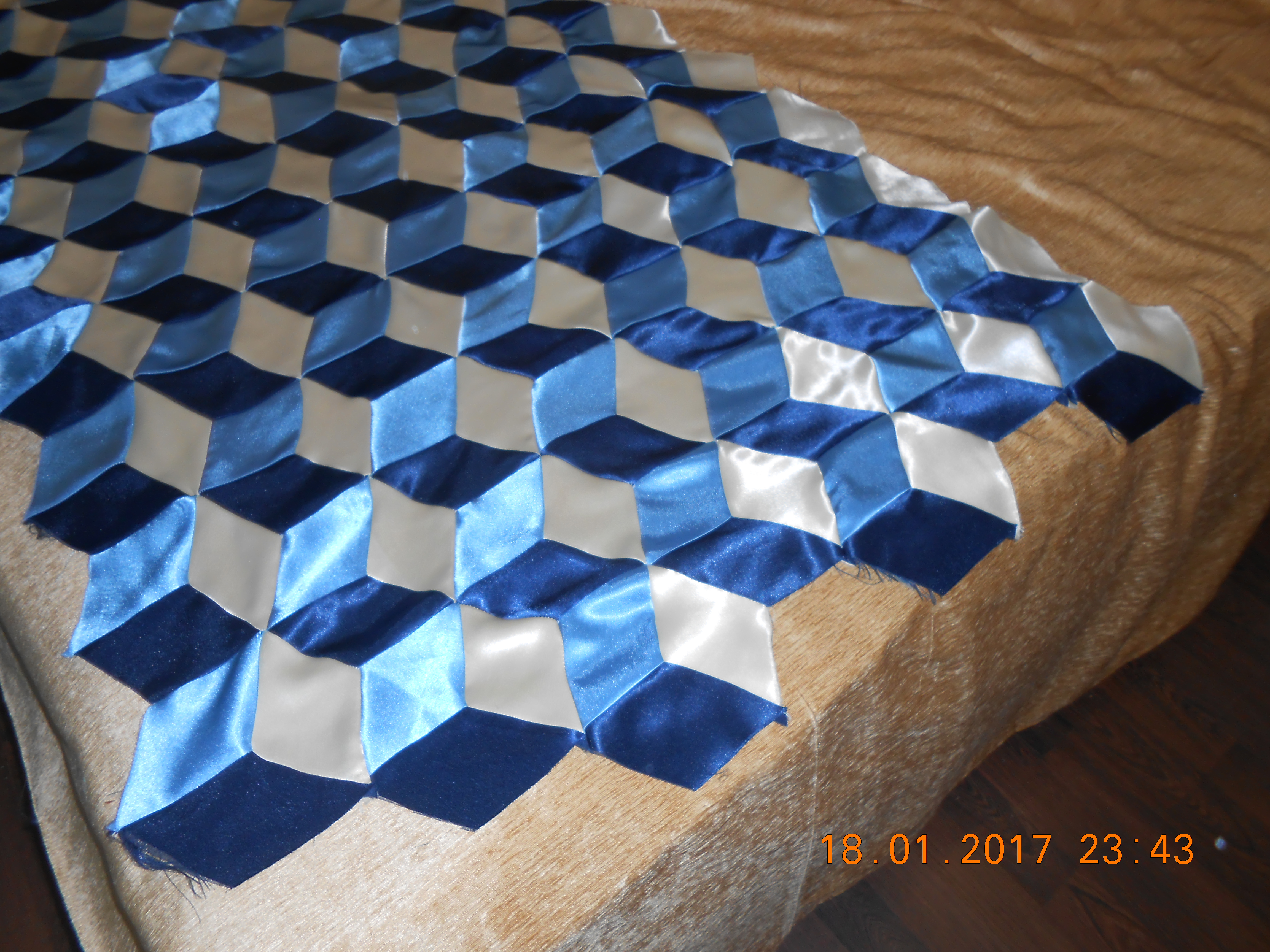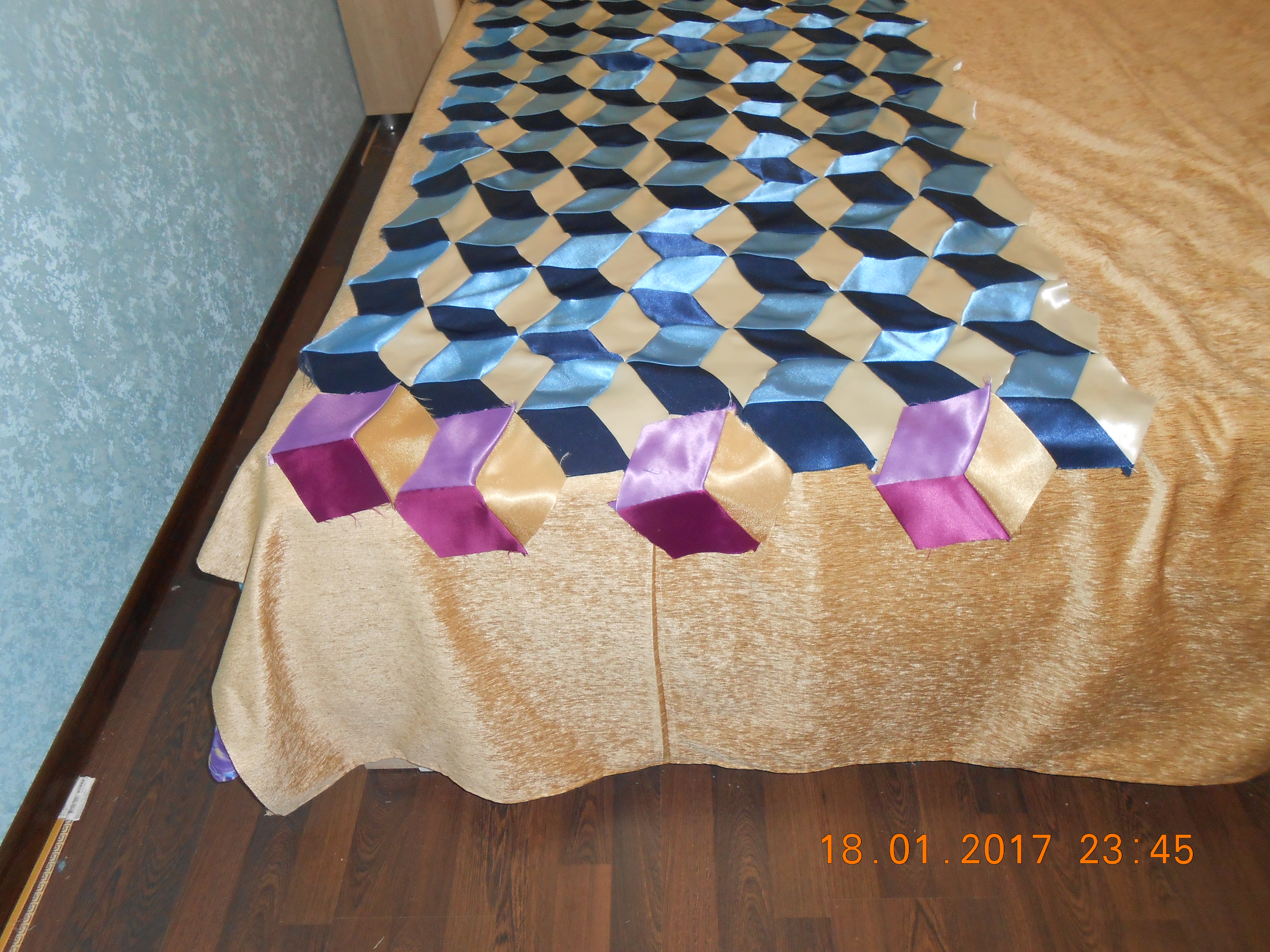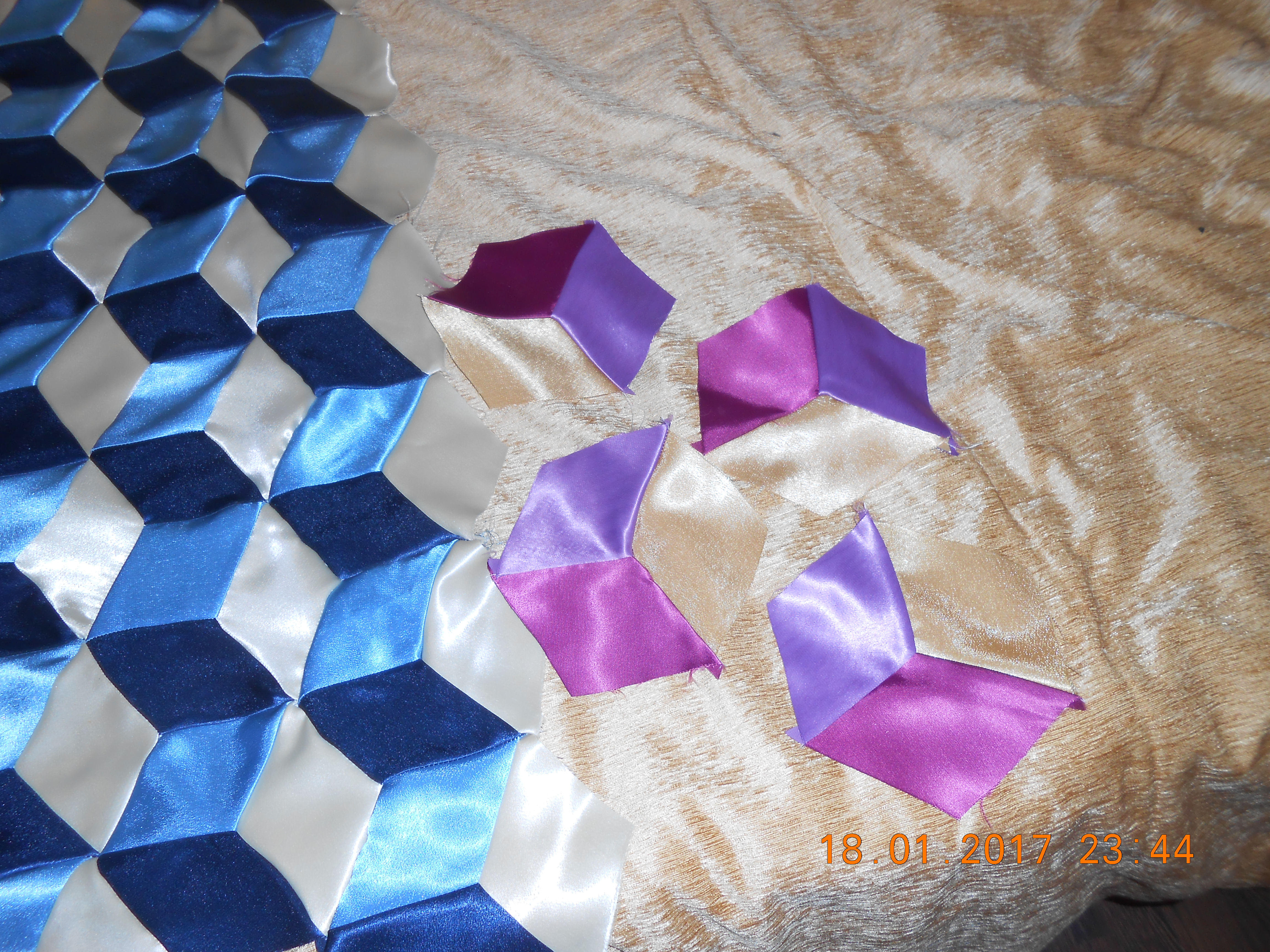 Дорогие подружки вам понравилось мое покрывало, а вот это я тоже пыталась сшить, но так и осталось недошитым, сначало нехватило шелка, поехало в магазин такой кончился, пришлось брать другого цвета, потом сломалась машинка.. Потом померила в длину нужно частично убирать а в ширину добавлять. Положила подальше, может в следующую зиму руки дойдут наконец и до него. Шить сложно на угол. Покажу пока фото какие есть.