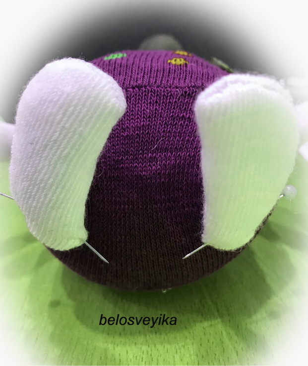 7) ушки по середине прошить насквозь одним стежком черной ниткой(я вначале прошила белой,а потом черной)