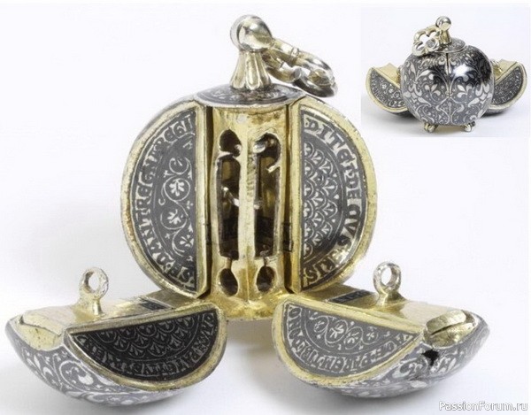 Серебряный позолоченный помандер с шестью сегментами, высота 7 см, Англия, около 1600 г., коллекция музея V&A, Лондон.