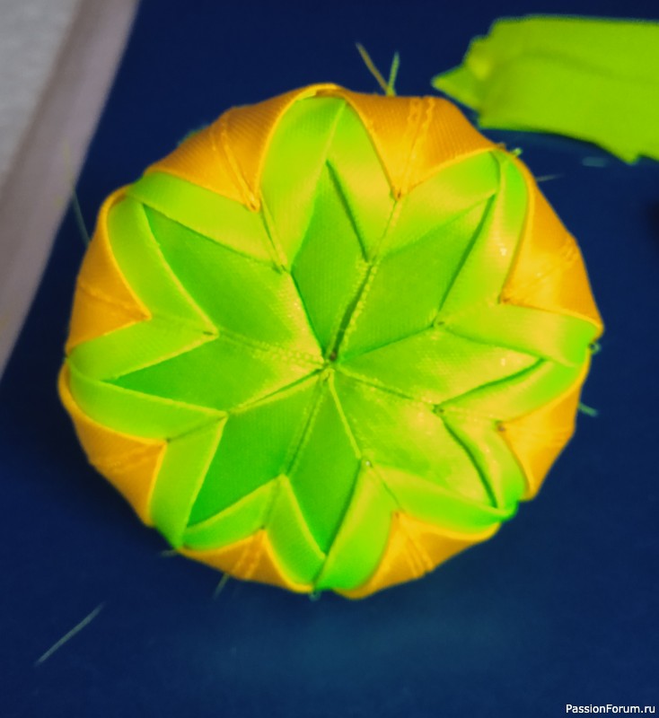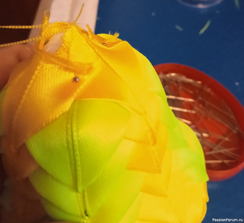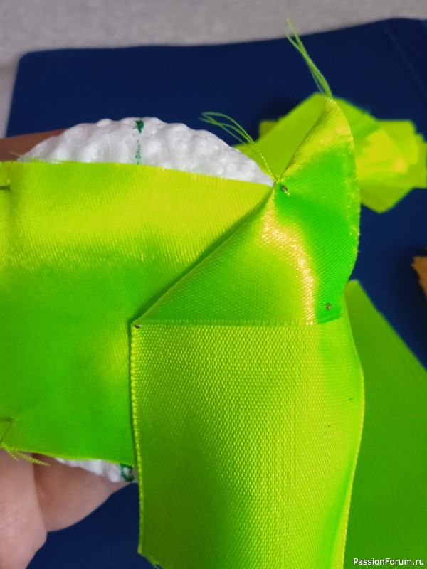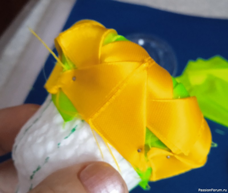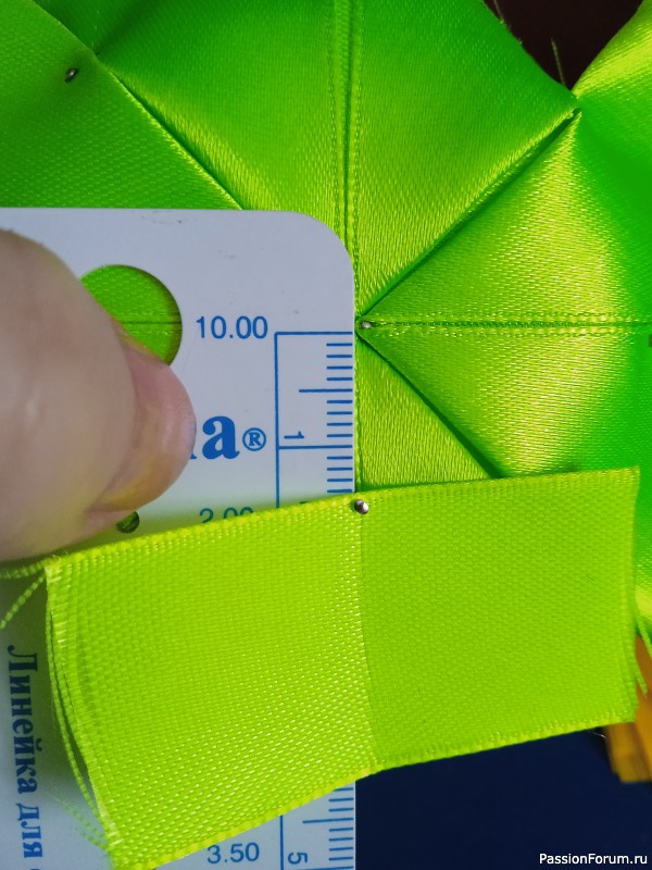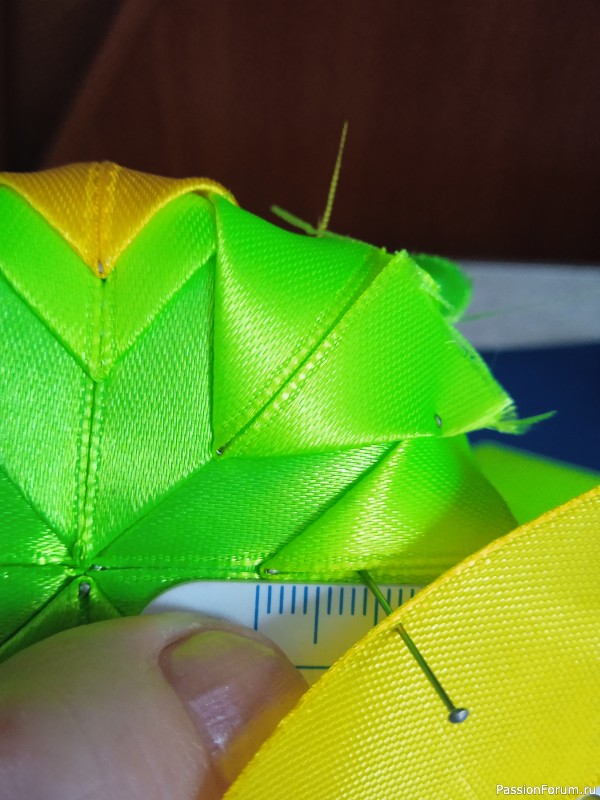 Пригибаем свободные стороны ленточки к середине и закрепляем иголочками. Прикрепляем таким образом все 4 отрезка широкой ленты.