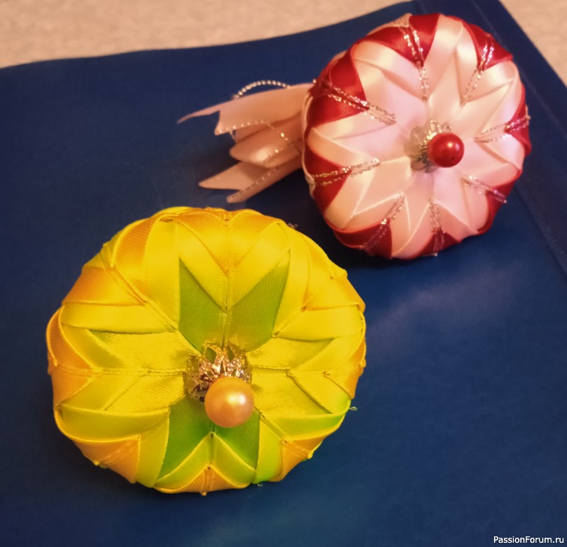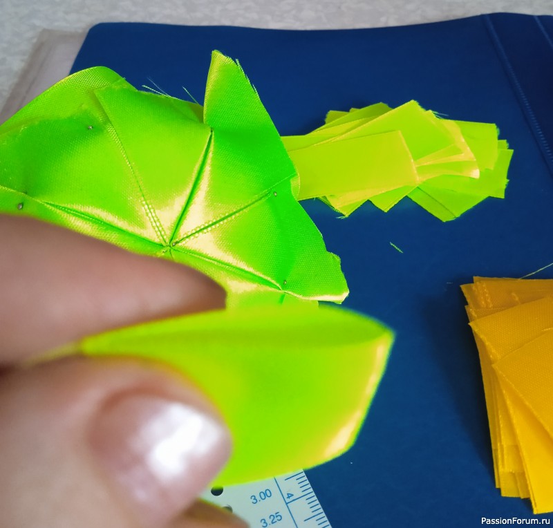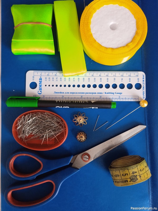 2,5 см двух цветов: светлая – 1м 40 см (у меня салатовая) и темная – 1м 60см (желтая) - Лента атласная шириной