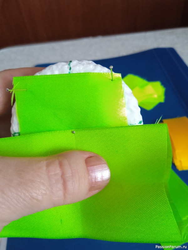 Сгибаем отрезок пополам = находим середину, в сгиб втыкаем иголочку, немного отступая от кромки, и втыкаем иголочку в середину основания