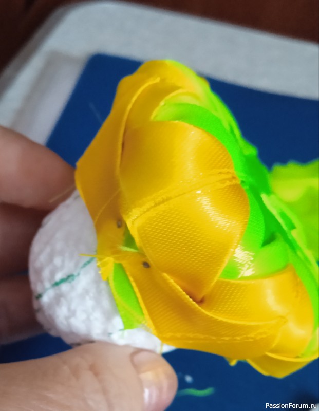 Теперь берем отрезок узкой ленты этого же цвета. Повторяем те же действия и крепим к основанию, отступив от центра