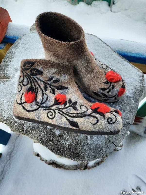 Изысканный декор, розы на подтаявшем снегу. Очень красиво и оригинально! Ну и сами чуни видно, что тонкие, отличный войлок! Браво, Галя!