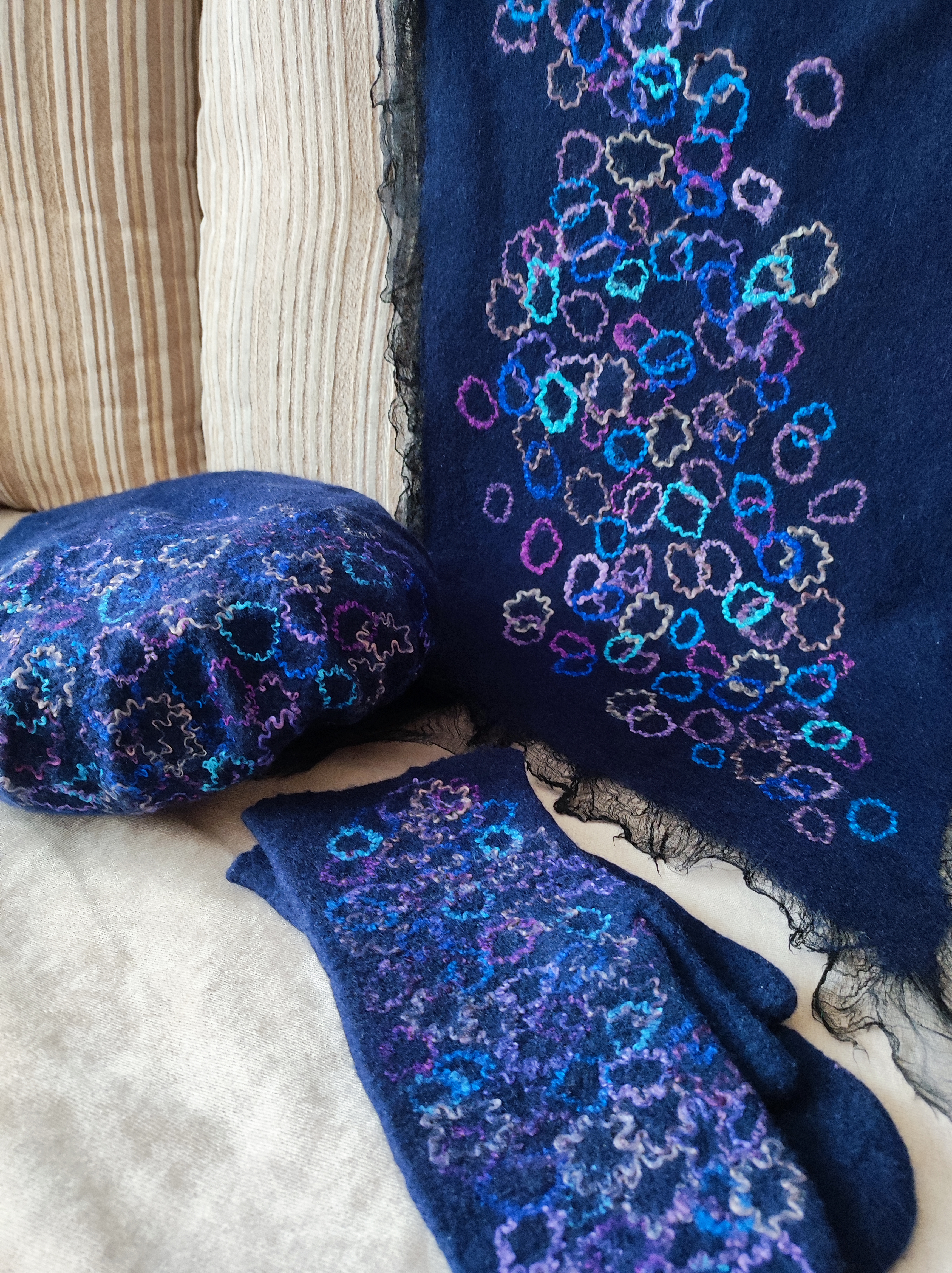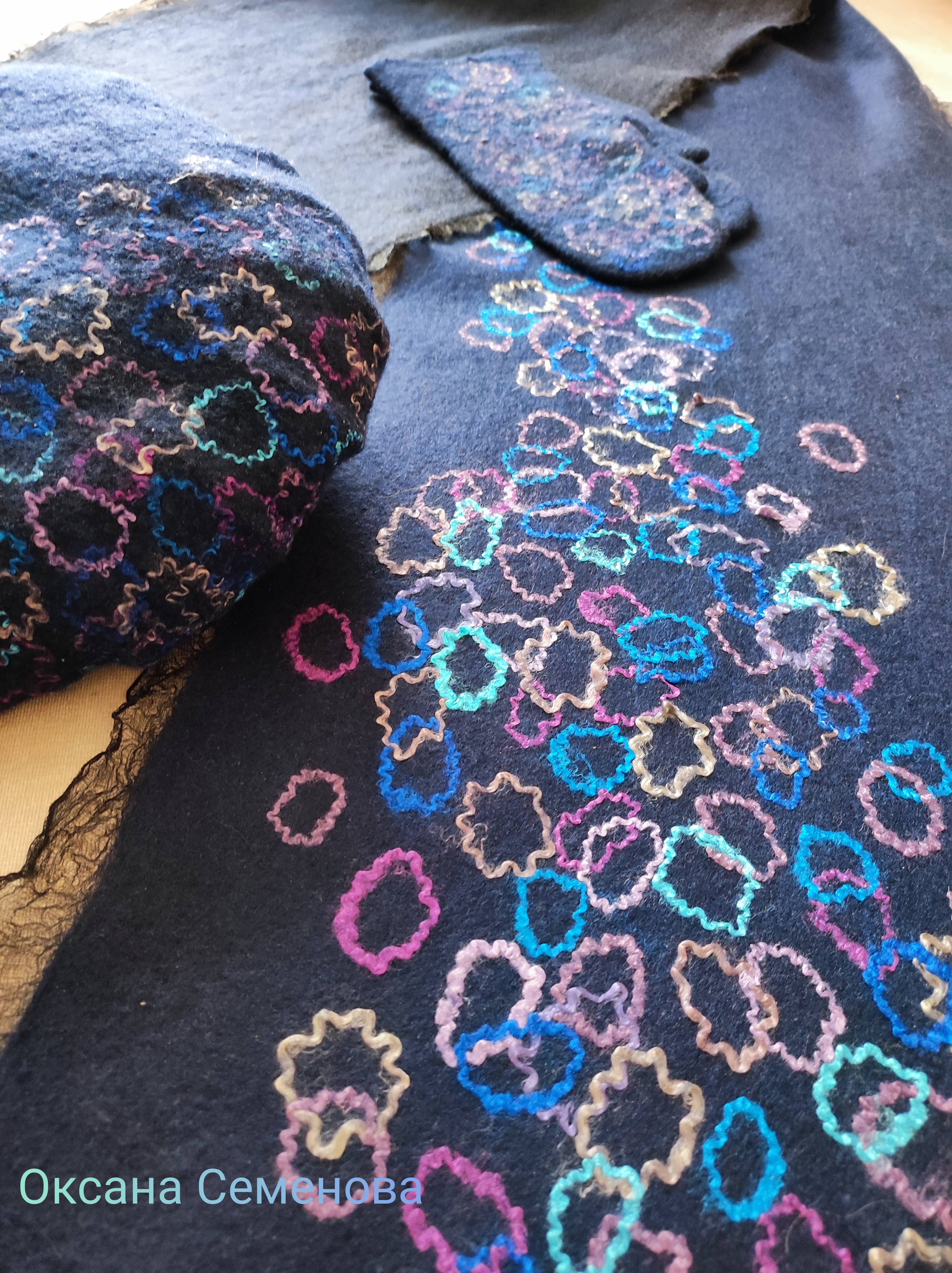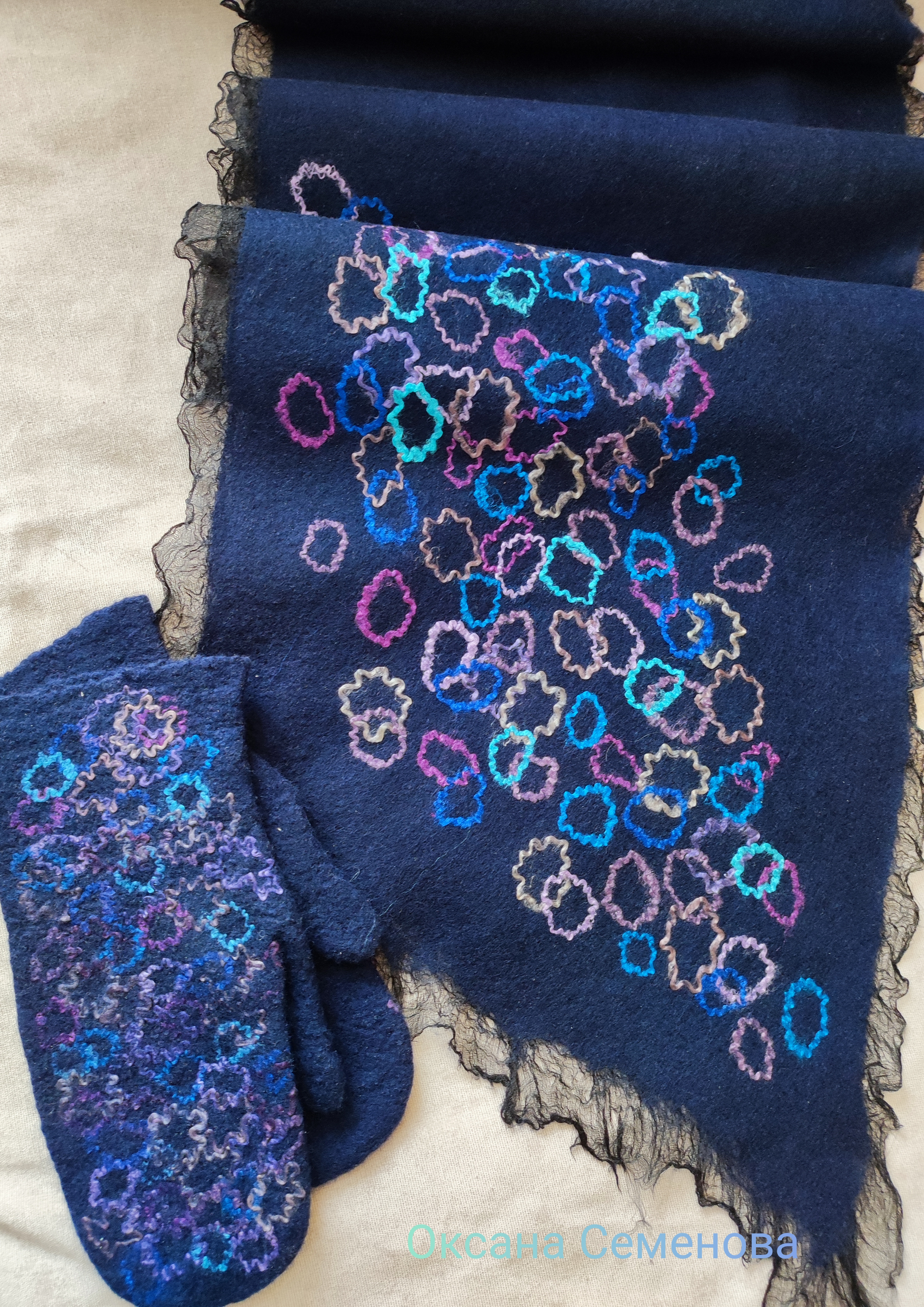А пока немного о работе. Этот декор из вискозы в виде звездочек я уже показывала на варежках. Понравилось, и я решила повторить его уже в комплекте. Свалян из итальянской шерсти с использованием разного цвета вискозы. Шарф шириной 33 см на 1,8 м, свалянный на окрашенном вручную разреженном шелке, получился тонким, пластичным, впрочем , как и варежки , вес которых 36 грамма.