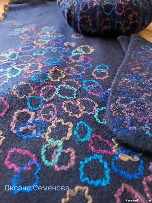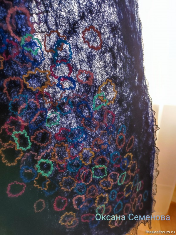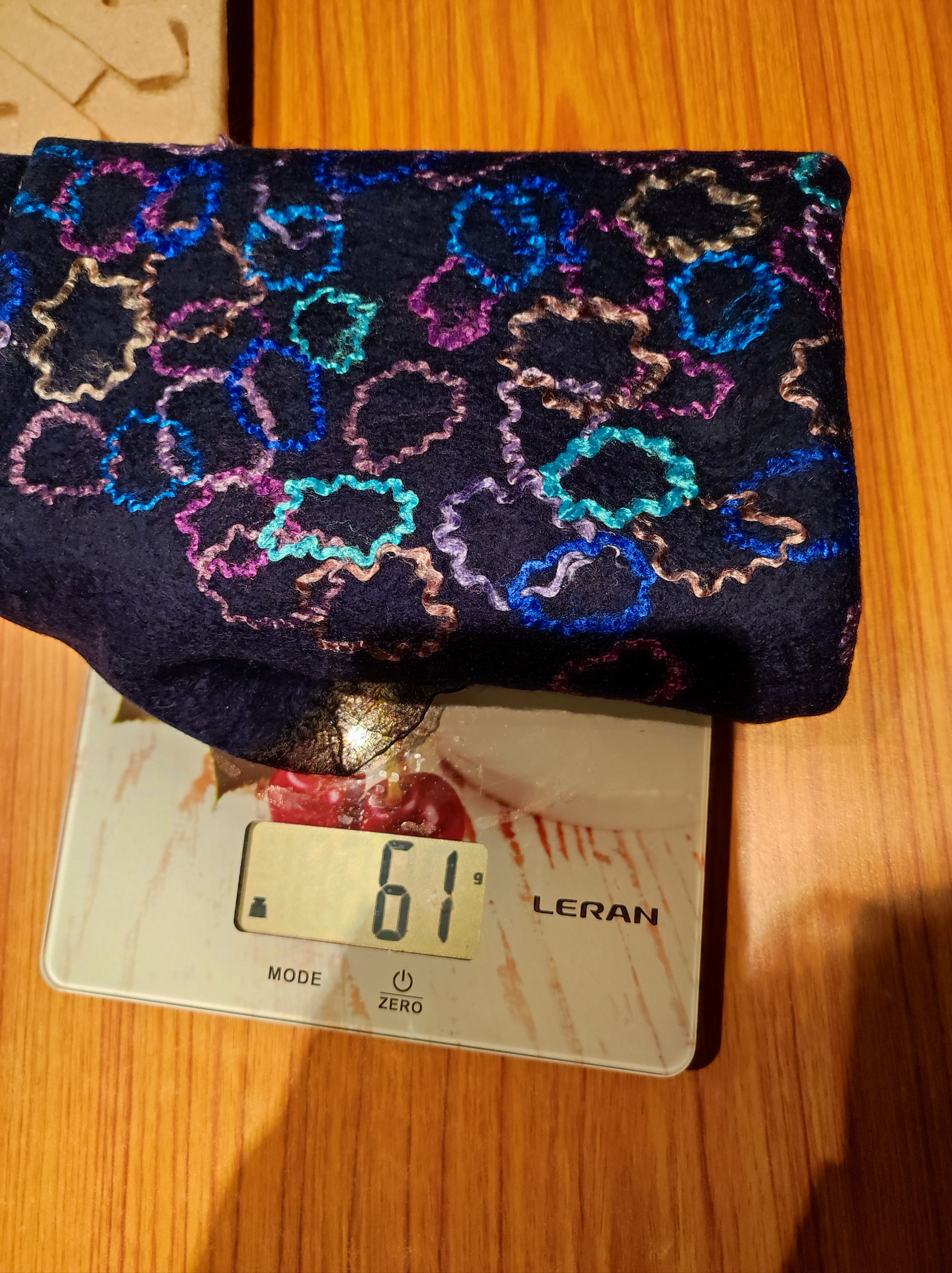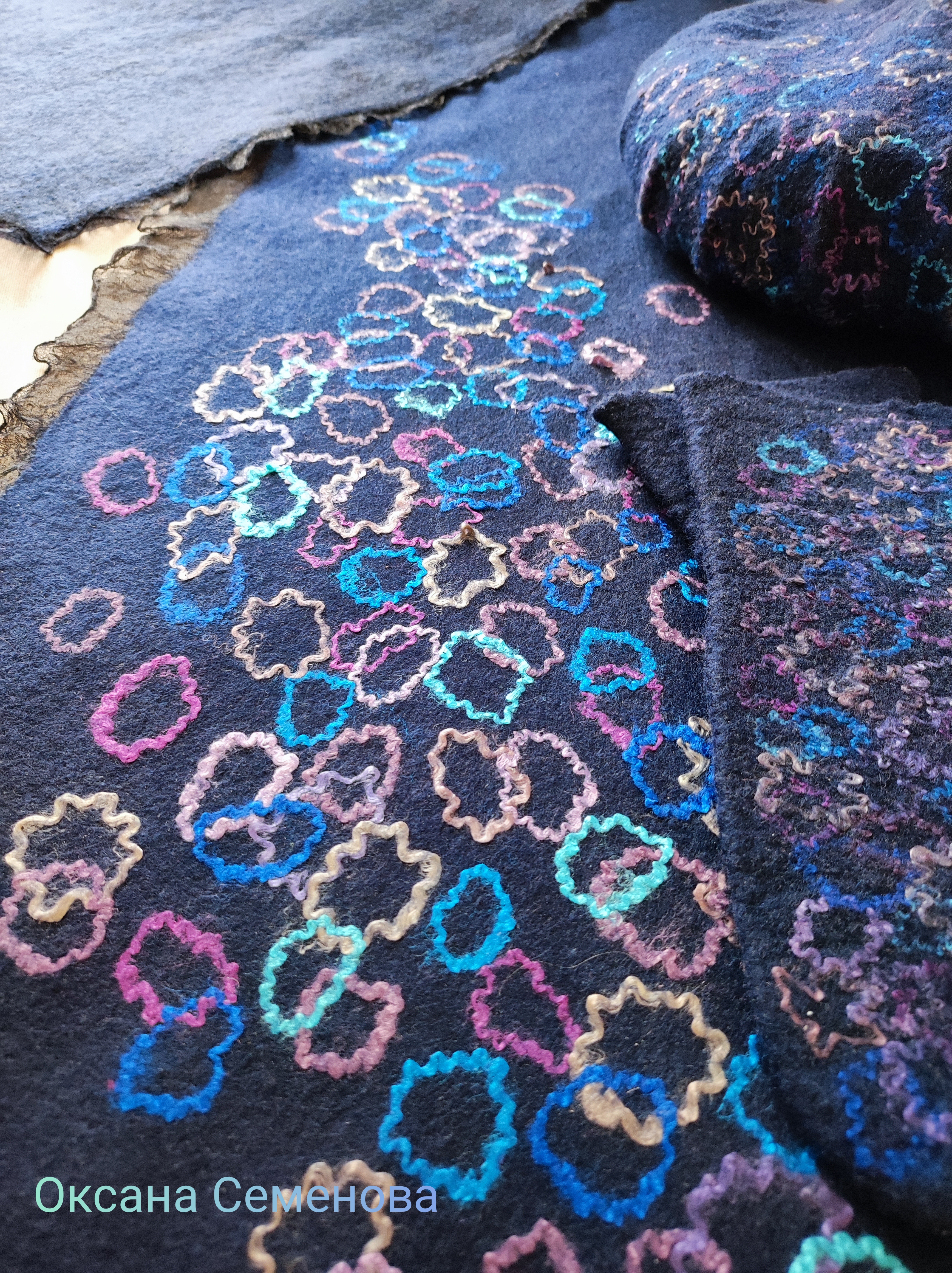 А пока немного о работе. Этот декор из вискозы в виде звездочек я уже показывала на варежках. Понравилось, и я решила повторить его уже в комплекте. Свалян из итальянской шерсти с использованием разного цвета вискозы. Шарф шириной 33 см на 1,8 м, свалянный на окрашенном вручную разреженном шелке, получился тонким, пластичным, впрочем , как и варежки , вес которых 36 грамма.