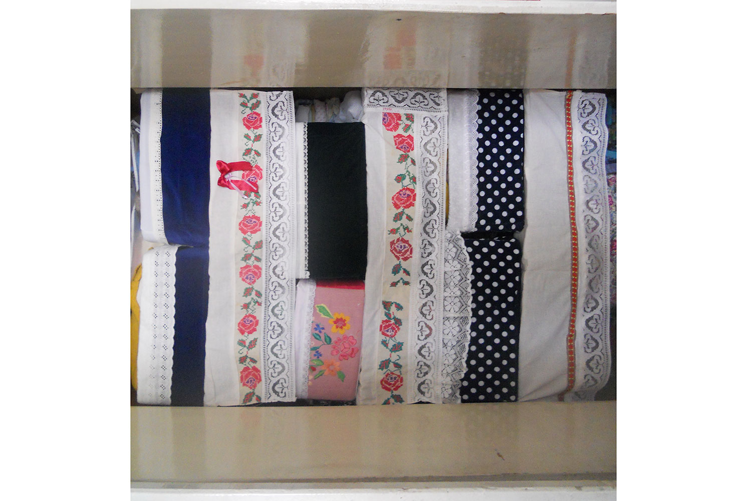 Сохранилась у меня вышивка мамы - большая салфетка на комод. Решила как-то ее реанимировать. Я оформила полки в кладовке. Вышивка мамина давно пожелтела ( и не мудрено: более 50-тидесяти лет ), ткань рыхлая, ветхая, поэтому отбеливать побоялась, так как совсем рассыплется. Вырезала, продублировала флизелином, на месте маленькой дырочки пришила бантик. Короба сшила, сложила вещи по назначению. Смотрю на вышивку и не замечаю ее дефекты, на душе светло как будто вернулась в детство. Вспомнила, как когда-то опрокинула на эту вышивку чернильницу, а мама потом отстирывала большое чернильное пятно.