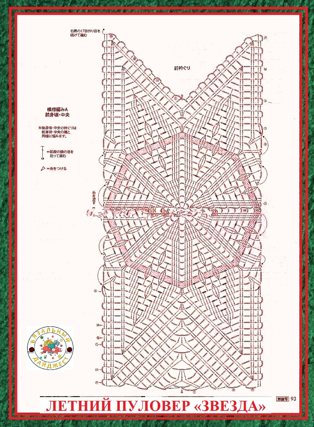 В этом варианте за основу взят большой мотив с остроконечной звездой, её макушки дополнительно расположились и на рукавах, что придаёт модели целостность. Ажурная сетка с использованием столбиков с накидом и длинных воздушных цепочек аккуратно огибает его по периметру. Судя по схеме, этот же мотив расположен и на спинке. Видно, что левая половина схемы – относится к спинке, а правая - к полочке, на ней указаны убавки для выреза горловины. В целом это очень лёгкая и воздушная модель.