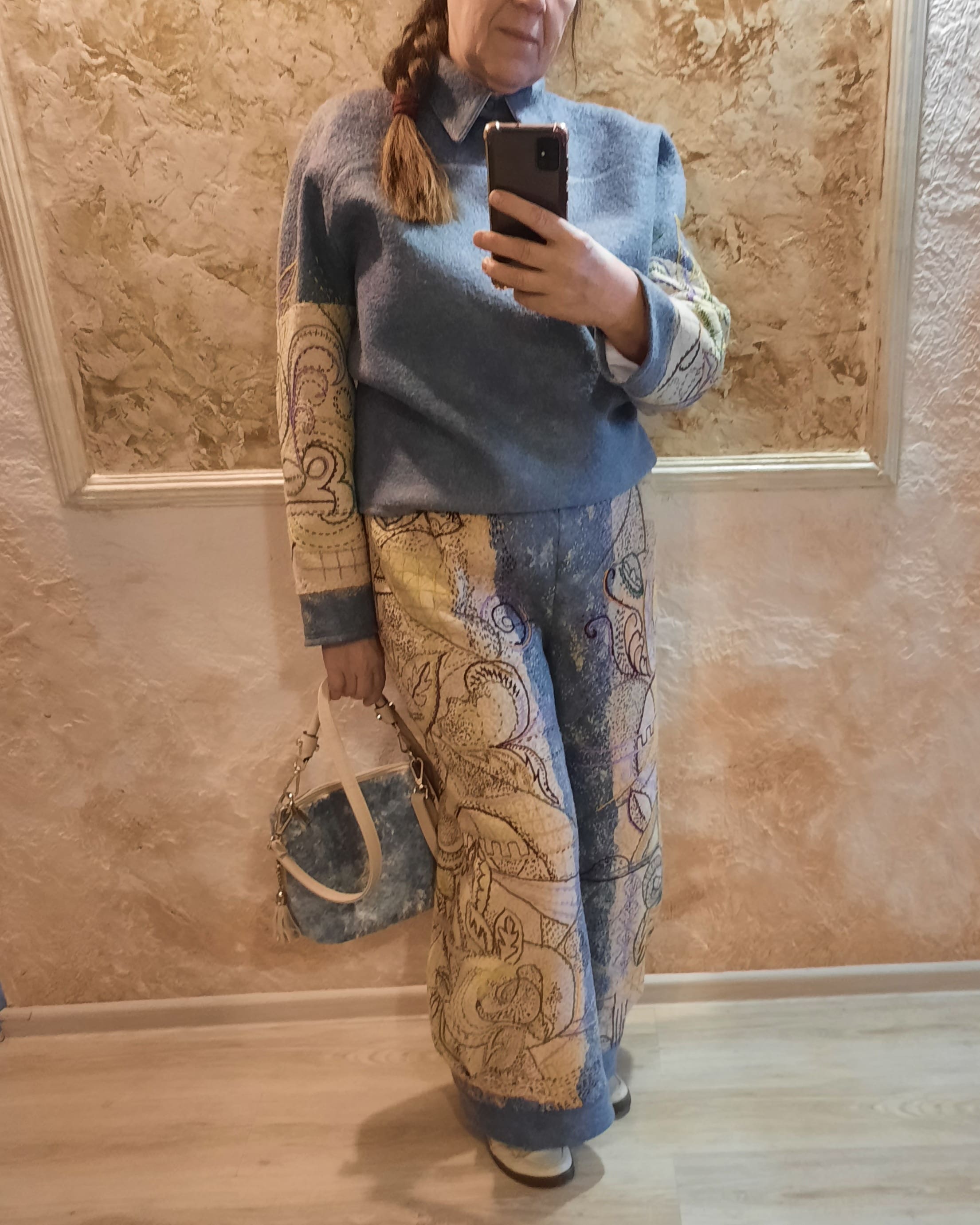 Галина, какой стильный костюм! Сочетание цветов очень гармоничное! И вышивка — фантастика! И сумочка ХОРОША! Руками хочется посмотреть, повертеть и изучить!!!