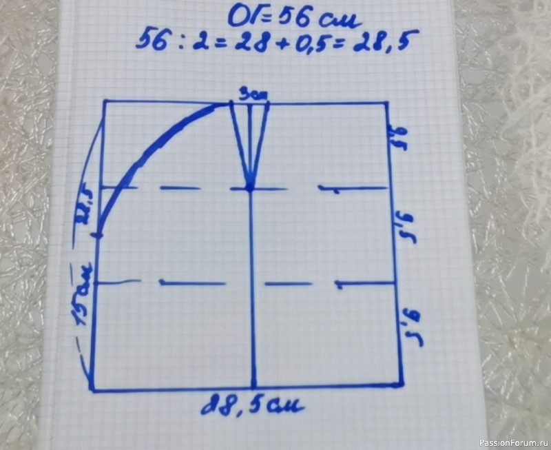 В интернете нашла формулу для выкройки (ОГ:2+2см), но по этой формуле у меня получилась шапка больше, чем нужно) Наверное, это зависит от ткани. Поэтому вывела свою формулу для шапки из не очень тянущейся ткани)) ОГ:2+0,5см.