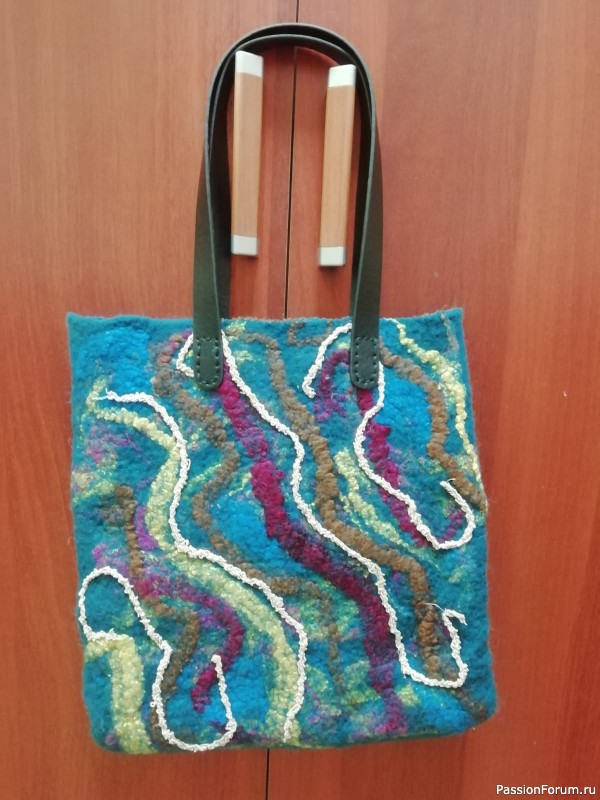 не всегда получается то что задумывалось... вот в этот раз- шерсть сожрала вискозу и не подавилась. Получилась не сумка, а чудо в перьях....Девочки, вы все такие мастерицы, я прошу у вас помощи. Как можно насытить дизайн? чем? где? моя фантазия где то заблудилась...