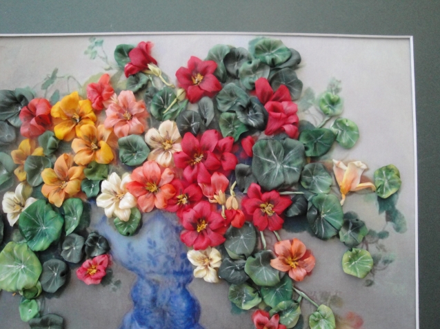 Принт вышитый белыми шелковыми лентами,тонированными до и после вышивки,ваза обработана 3D гелем