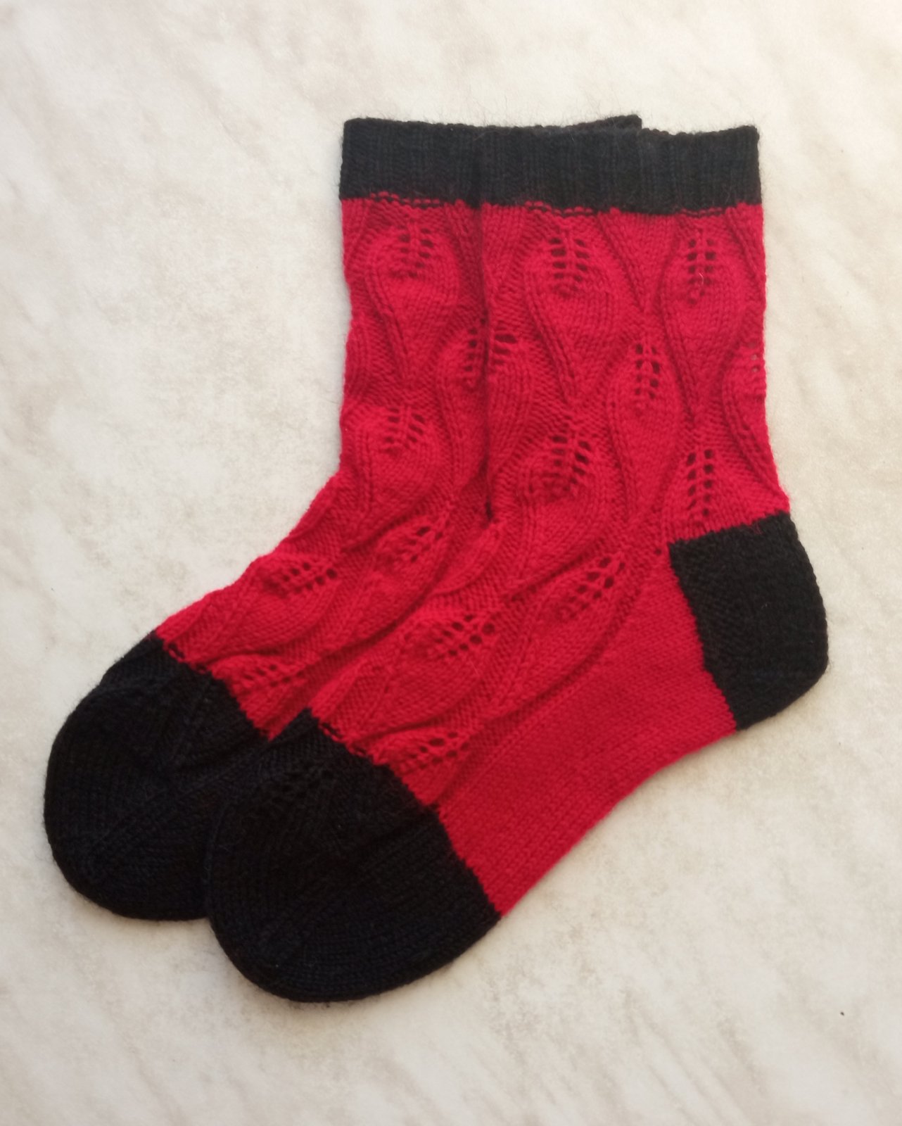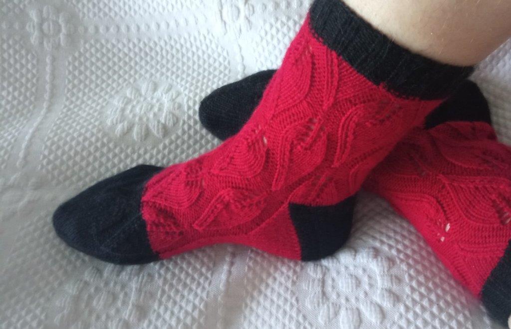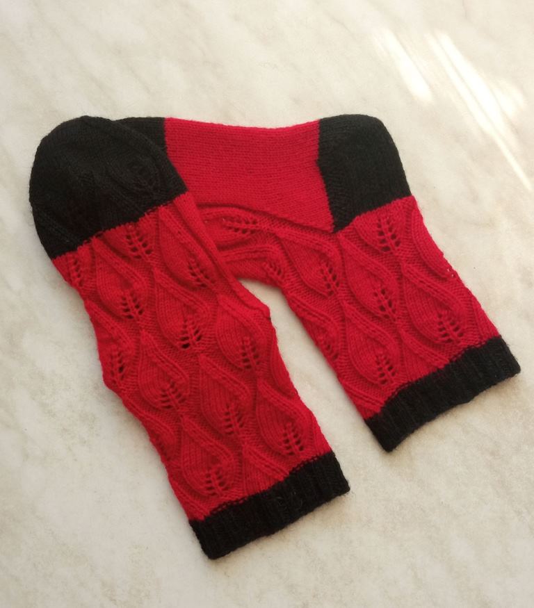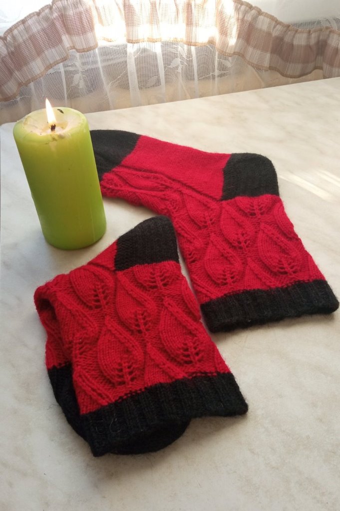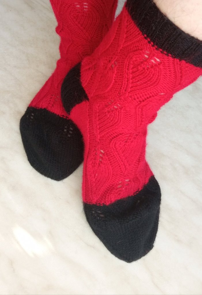 Всем рукодельницам добра и творческого вдохновения! Очередная утилизация пряжи. Увидела здесь на сайте носки "Флога" https://www.passionforum.ru/posts/143068-noski-floga-spicami.html и не смогла не связать, очень понравился рисунок. Только ниточки красные и черные, супервош. Поэтому и всплыл в голове образ цыганки Кармен, как она сгорела в пламени любви. Спицы №2,5 и №2 -резинка.