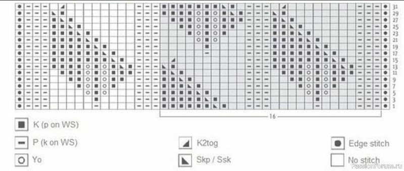 Спасибо, Ирина, очень приятно! Пустые клеточки — нет петли. Количество петелек в рядах разное, за счет этого рисунок объемный. Самый первый ряд (его здесь нет) 7 изнаночных, 9 лицевых, затем 1 ряд по схеме и и т.д. Ещё я лопухнулась немного, после резинки надо провязать один ряд лицевыми, чтобы не было пунктирчиков после резинки. Темный квадрат — лицевые, остальное я думаю понятно.