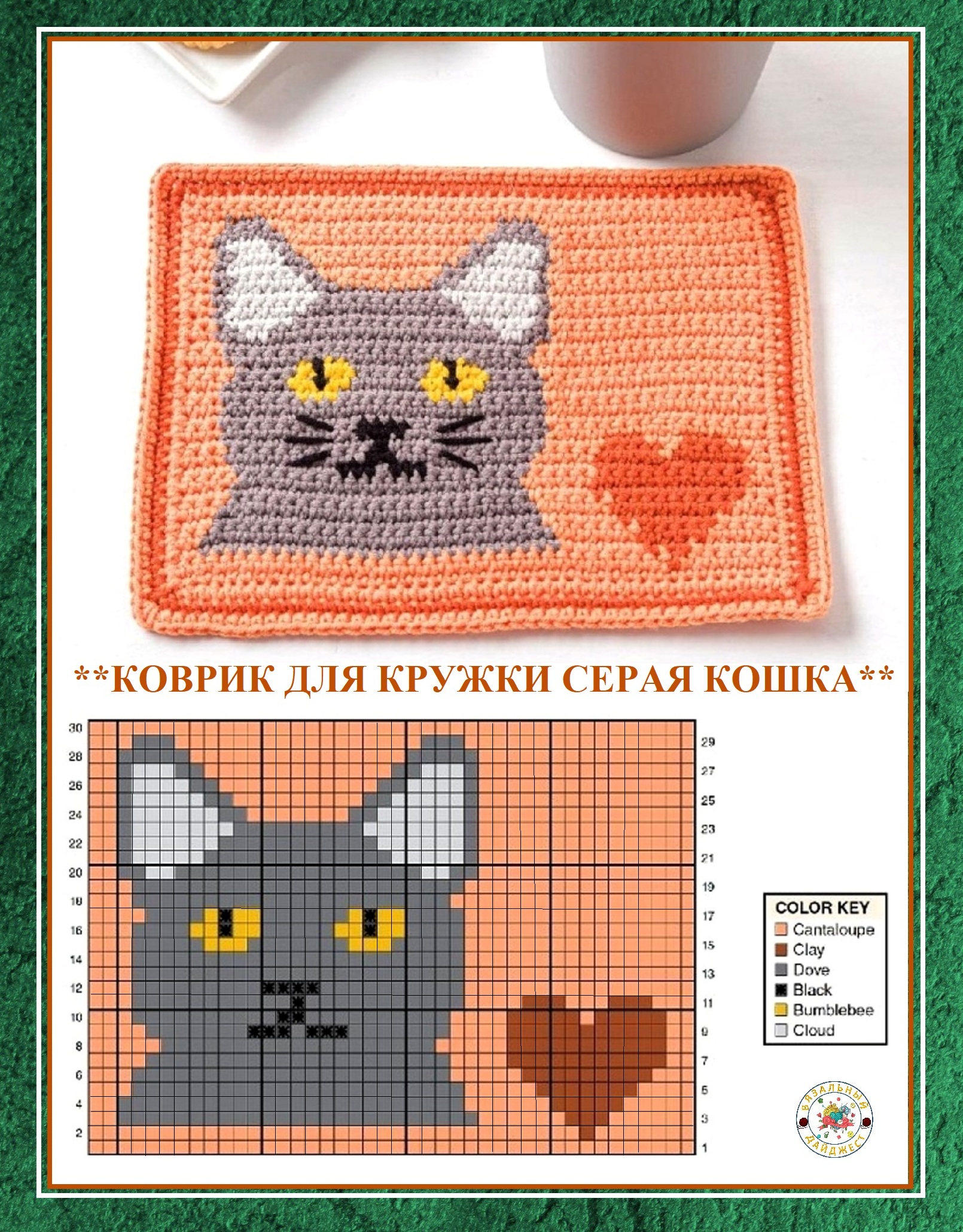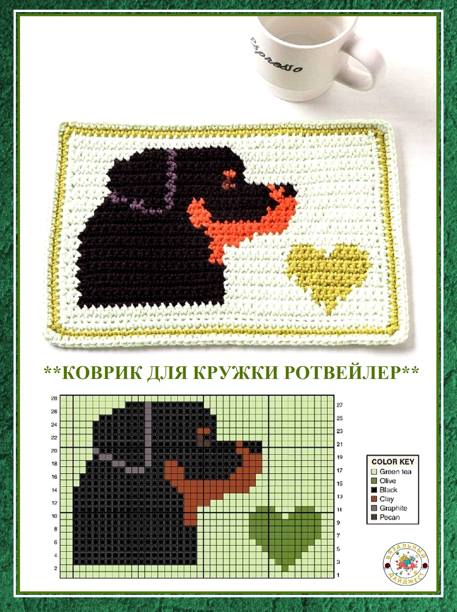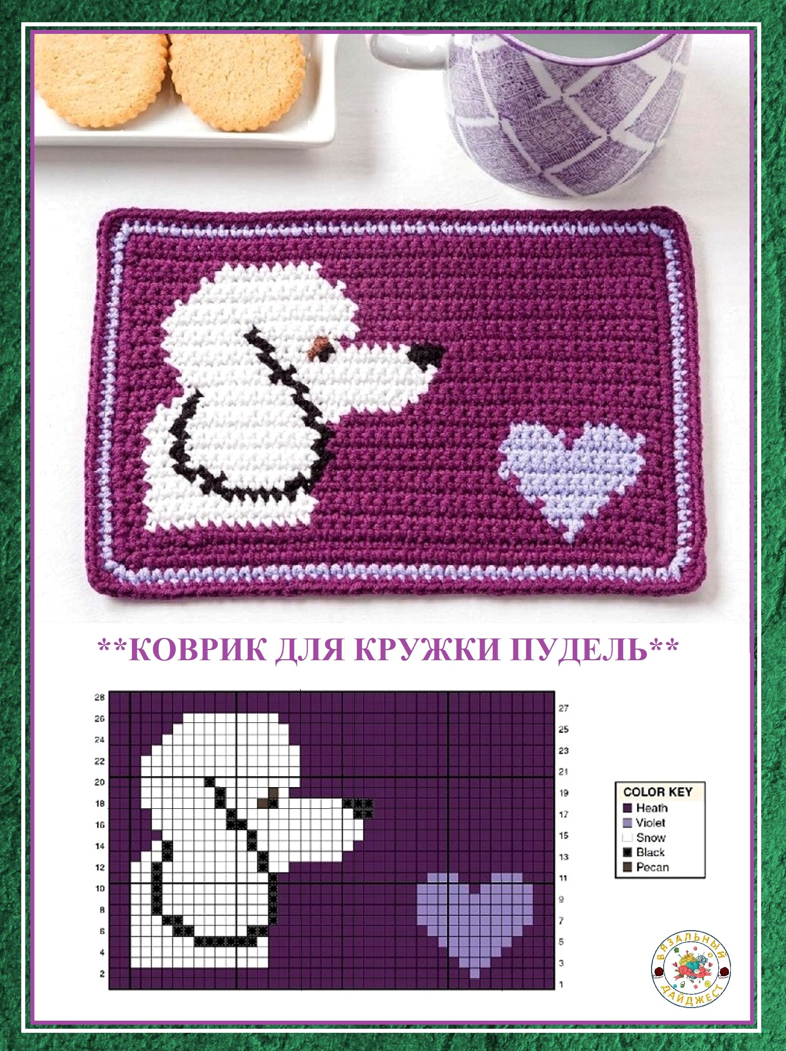 Встретилась интересная книга «PetMugMats» от Лизы Макдональд, в которой даны яркие и оригинальные схемы салфеток-подложек под чашки для оригинального декора сервировки вашего стола. Мне особенно понравилось использование в этих мини-ковриках салфетках изображений милых и всеми любимых зверушек, наших домашних питомцев – кошек и собак. В этом разнообразии вы сможете не только выбрать понравившийся рисунок и схему, но и запечатлеть при помощи ниток и крючка изображение своего любимца.