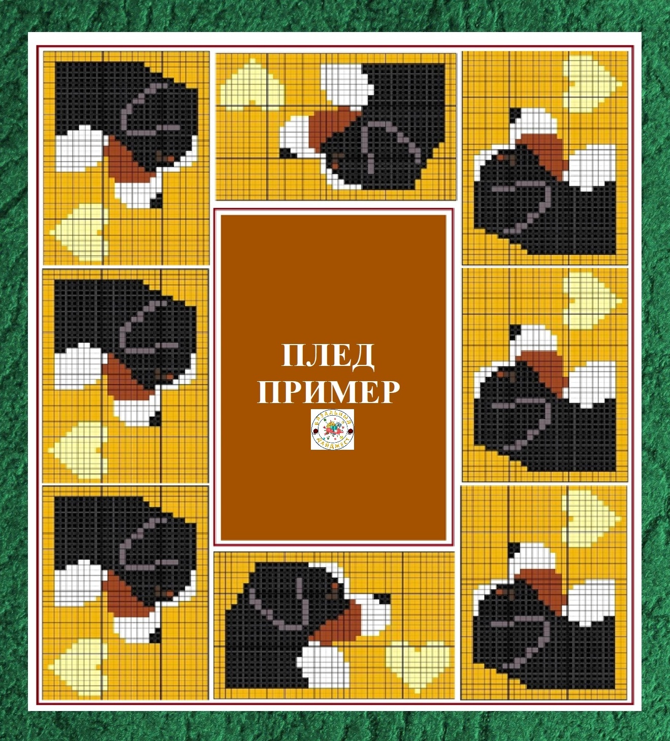 Ну и конечно же всеми любимые пледы с изображением любимого питомца, здесь как вариант схему можно просто продублировать в высоту и ширину до нужного размера, получая плед из квадратов с одним изображением или несколькими. Вот для наглядности несколько схем изобразила: