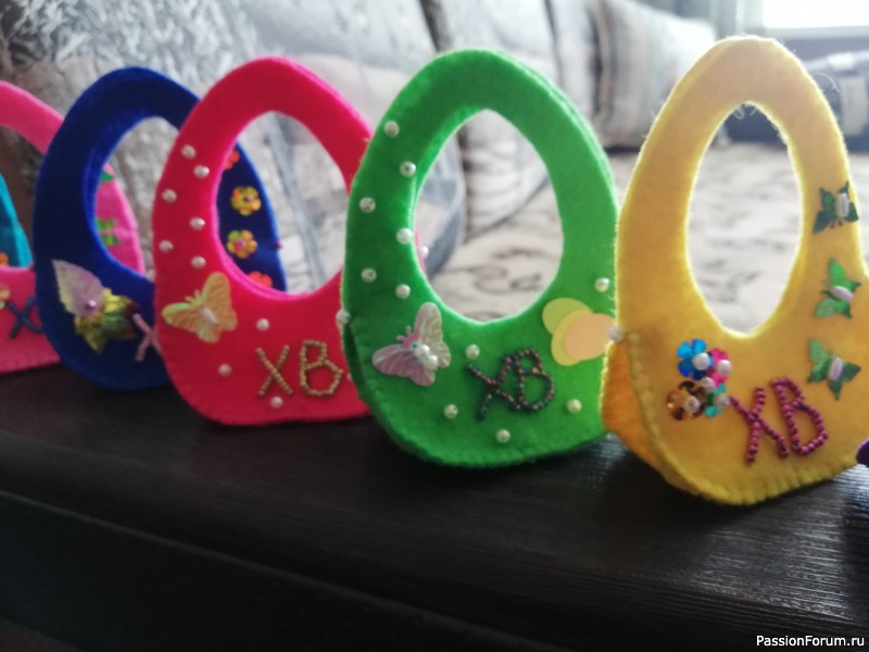 Вот разноцветные фетровые сумочки для пасхальных яиц.
