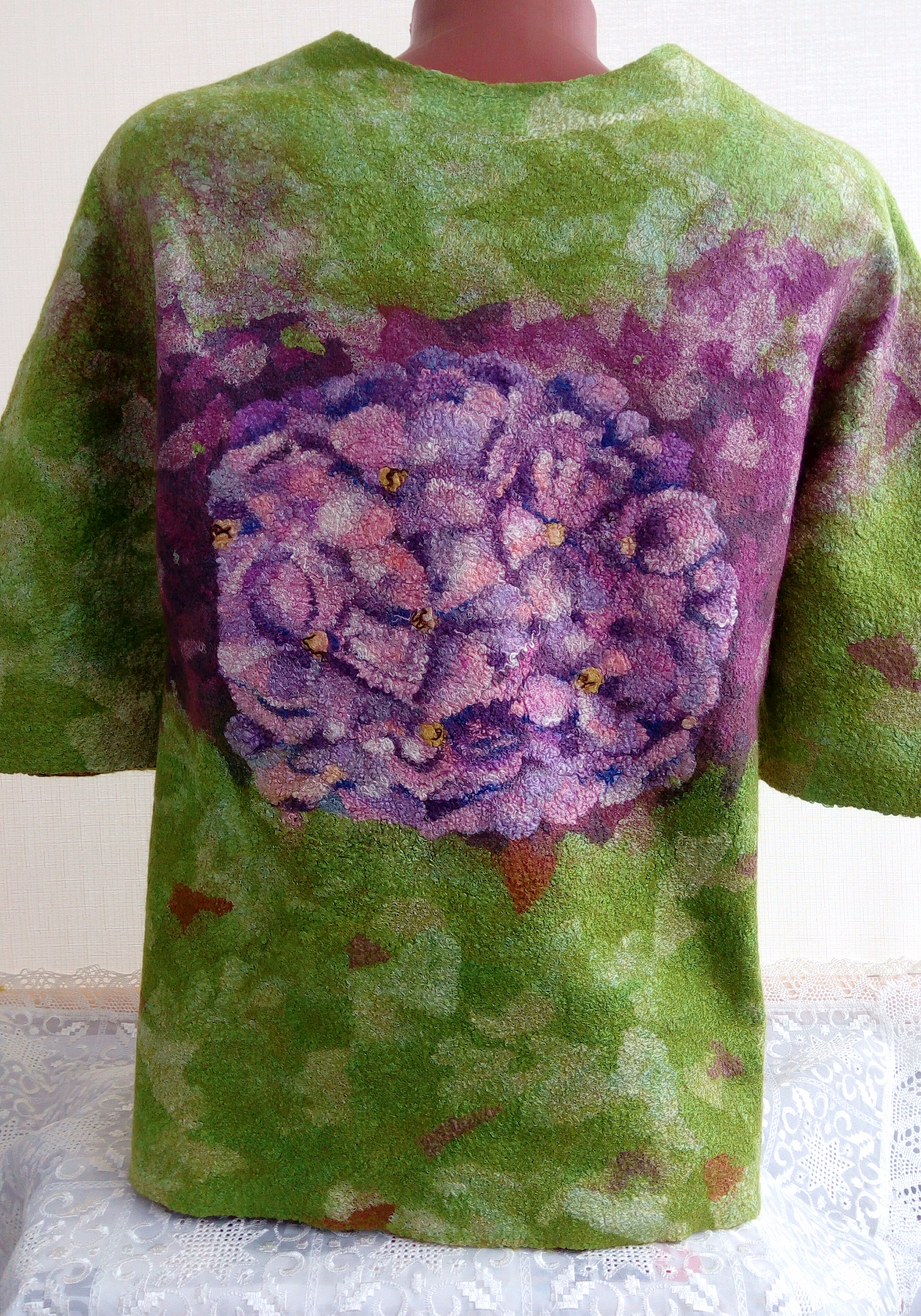Общий привет! За окном снегопад, а я вырастила цветок. По следам предыдущего Шерстивального МК Натальи Король сделала микс из двух её техник - живопись мазками и волокнами. Гортензию создавала вискозой, а листву нарезанным маргеланским шёлком. Но готовое изделие не очень-то и удовлетворило. Думаю, цветок надо было крупнее выложить, а то мелковато получилось. И фон винного цвета двух оттенков должен был схематично изобразить соседние цветы, а получились кляксы. Снимала на манекене на лоджии, т.к на себе из-за мрачной погоды не получилось. Манекен повернула "коленками назад", дабы не деформировать декор)) Хочу послушать мнение зала - нужно ли дополнительно усилить лепестки цветка, чтобы они не сливались? Может вышивкой?