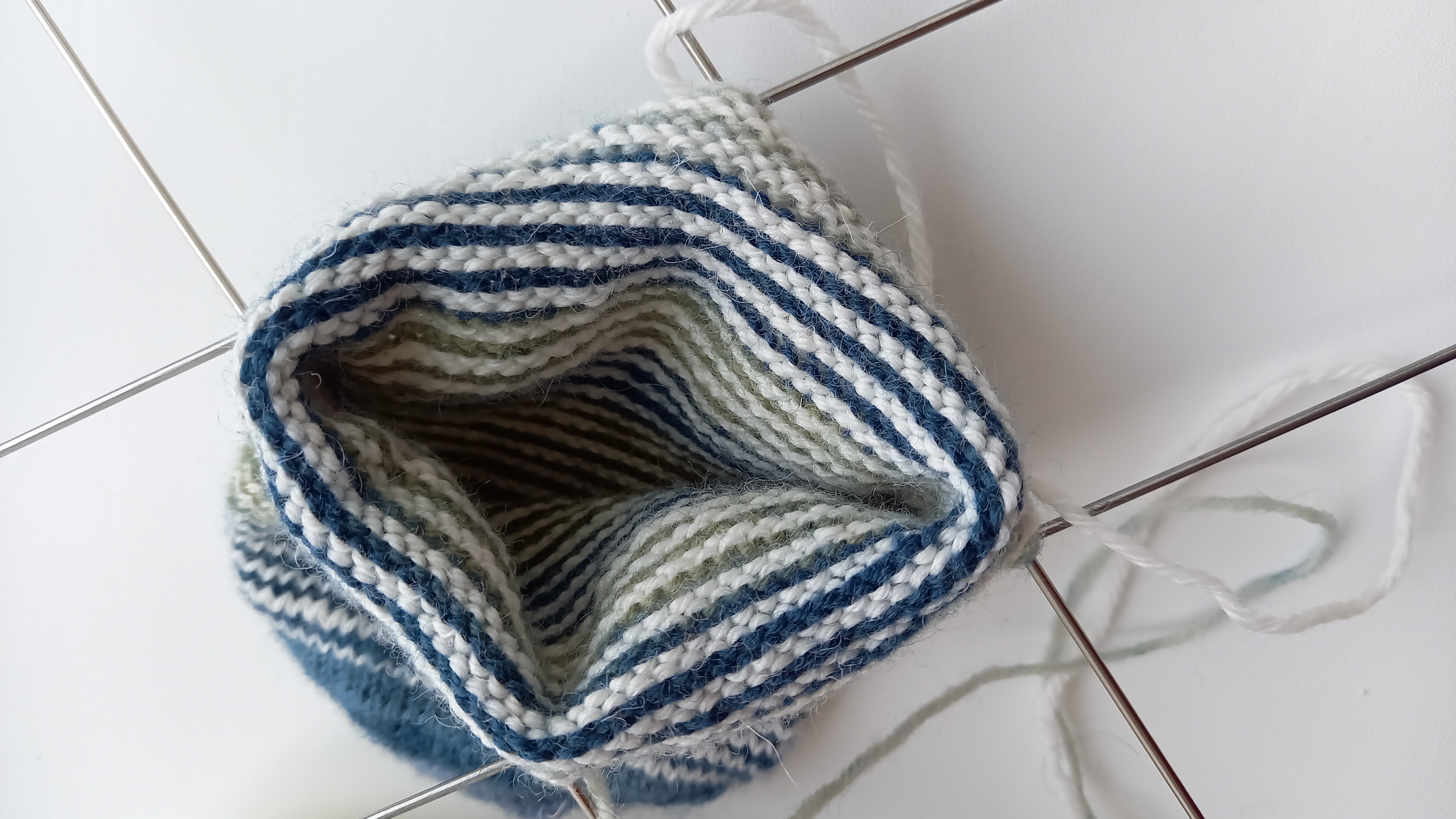Клин подъёма буду вязать на носочках с классической пяткой, с пяткой «бумеранг» не было смысла его вывязывать. Подъем небольшой, носок и так хорошо садится.