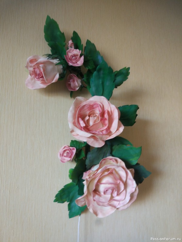 Настенный светильник, трехламповый. В длину, примерно, 90 см. Цветы выполнены из фоамирана. Можно крутить в разные стороны. Для удобства, сзади есть петельки. Вешать можно и горизонтально и вертикально. Диаметр самого большого цветка около 20 см.