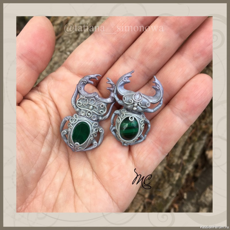 И снова здравствуйте! Сегодня покажу вам маленькие брошечки. Жук-олень из полимерной глины с малахитом.