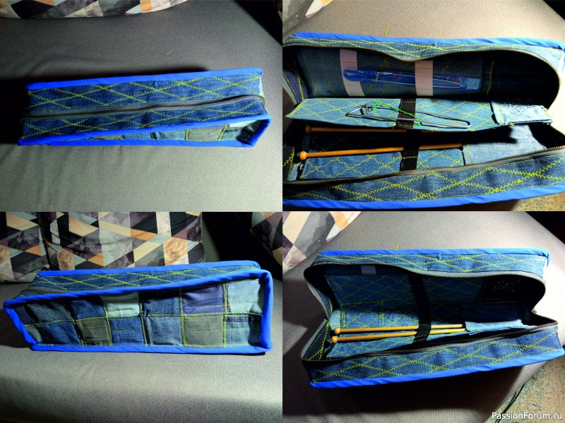 Пристрочила карманы (как газыри), широкую резинку для фиксации длинных спиц. Как всегда все шилось без выкроек, рисовала по ткани, промеряла, строчила... Новое в нем только молния и кособейка.
