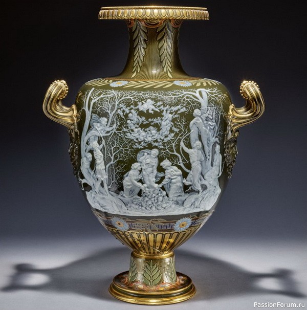 Ваза из паросской керамики с полихромным декором в помпейском стиле, высота 40,6 см, Mintons, 1876 г. Фигуры работы Марка Луи Солона, орнаменты - Генри Сандерса. Паросской называли керамику, имитировавшую структуру мрамора с греческого острова Парос. Ваза была приобретена для музея Виктории и Альберта на Международной выставке в Филадельфии 1876 года.