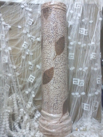 Итак - ваза. Заготовка - тубус от линолеума, загрунтовала, дно укрепила картоном и гипсовым бинтом, покрыла яичными скорлупками, Затем покрыла темно-коричневой краской, излишки удалила тряпочкой, чтобы темная краска осталась только в швах. Покрасила светло-коричневой краской. Получилась, на мой взгляд, имитация кракелюра. Наклеила листочки из салфетки, далее подрисовка. Обвела контур листочков и прожилки бронзовым контуром, немного затонировала листочки сухими перламутровыми тенями и покрыла лаком.