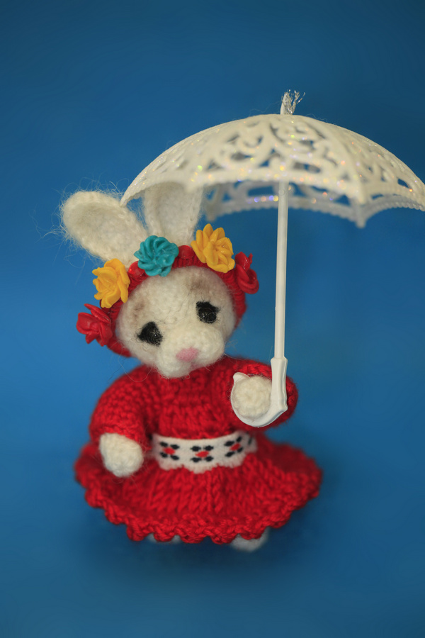 Зайчишка в платьице и веночке, связана крючком из мохеровой пряжи. Размер - 11 см без учета длины ушек. На каркасе из проволоки, включая ушки. Одежда и веночек снимаются.