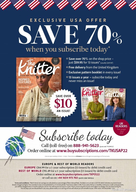 Популярный журнал "The Knitter" из Великобритании посвящен вязанию спицами. Каждый выпуск содержит новые оригинальные проекты трикотажной одежды и вязаных аксессуаров от известных дизайнеров.