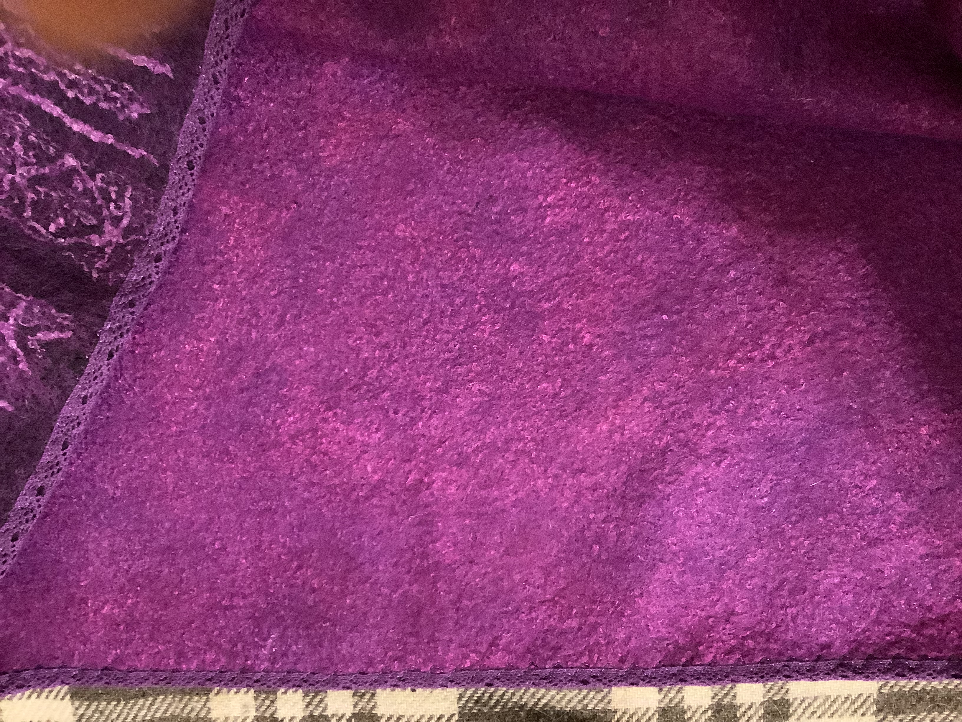 Вот итог моей работы.Маленький топик . Начну сначала. Шелковый палантин - очень тонкий эксцельсиор. Шерсти ~60 гр.вискозу не взвешивала. Раскладывать шерсть решила как мастера Кондрашева-Ткаченко, тончайшими пластами. Старалась очень. С кардочесом работаю редко, поэтому пласты мои отделяться не хотели, путались и расползались. А кое где шерсть была настолько коротка и в обрывках, просто труха какая то. Я засомневалась даже в ее качестве. Может это шерсть другого производителя?Мне не понравилась эта шерсть уже в раскладке. Кое как распределила я эту рванину по шелку. Кое где сомневалась в качестве раскладки и добавила тончайшие прядки ленты похожего цвета.На шерсть уложила вискозу облачками, довольно плотно. Валяние прошло как обычно, все по плану, и хорошо, но!После стирки во время сушки я стала разглаживать изделие руками и обнаружила на руках волокна шерсти, похожие на пух, и довольно много. Как будто я побрила изделие. Но я не брила . Пуха вылезло очень много. Если бы я вовремя не остановилась, что бы было? Ноэто полбеды. Шерсть дала краску и палантин из сине белого стал сине фиолетовый, видите? Герцогиня не удалась. И шерсть в работе меня не порадовала. А может просто я больше люблю гребенную ленту….