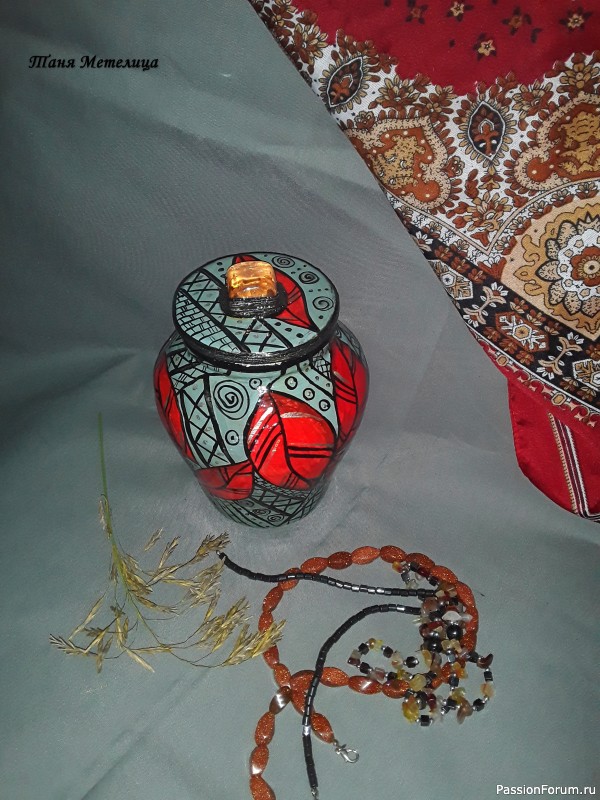 Татьяна, работы красивые. Рисунки радуют глаз.Но внутреннее покрытие акрилом делала бы не изнутри банки, а снаружи. То есть, как при обратном декупаже. И внутренний слой банки был бы нижним слоем наружного декора. Даже при использовании красок для росписи посуды рекомендуют при росписи чашек, бокалов, кружек оставлять безопасные 1,5-2 см. для соприкосновения с губами.