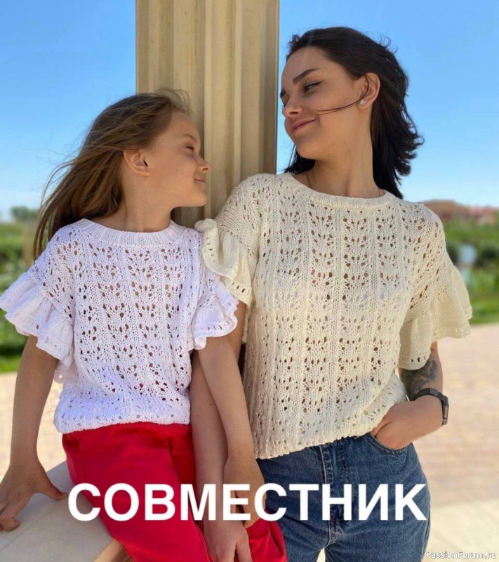 хороша кофточка! самое то для худеньких девочек. Почему подчеркиваю «худеньких»? Да потому, что воланы на плечах имеют особенность расширять эти самые плечи. Ведь то, что подходит ребёнку не всегда подойдёт взрослому человеку… тут уж нужно критически и философски оценивать свою фигурку. Можно для взрослой женщины и без воланчиков и резинки внизу (дабы не подчеркивать «сгусток нервов») обойтись, а семейный стиль подчеркнуть цветом и узором. Все, что я сейчас написала-чисто субъективное мнение, сложившееся от второго фото ( модели для подражания)- это мысли вслух.