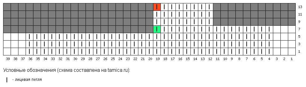 В седьмом ряду довязываем до петли, отмеченной зеленым.