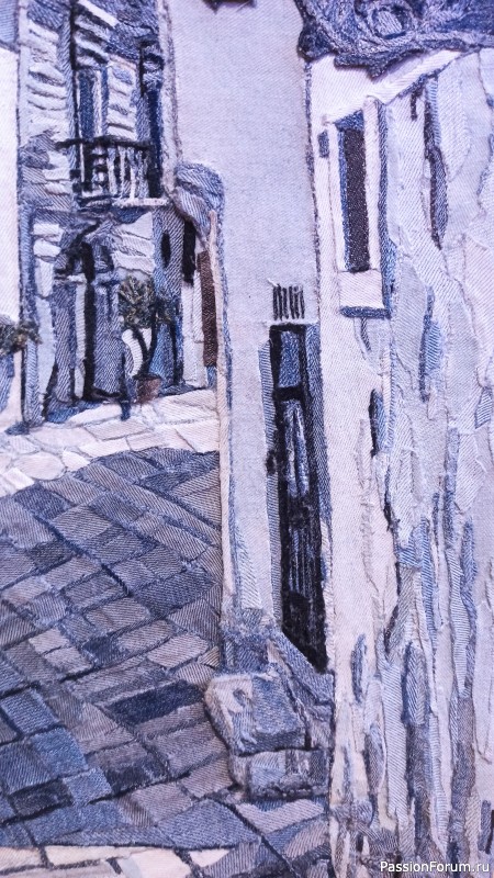Работа выполнена из кусочков джинсовой ткани по мотивам картины Николая Солодова "Улочки Монополи. Италия. "Размер картины 50х60 см. Для ее изготовления я использовала джинсовую ткань, клей и ножницы. Красками я не пользуюсь.