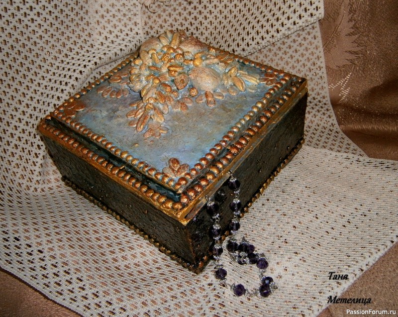 Эту шкатулку я сделала на основе пластиковой банки от ПВА. На пластилин закрепила узор из перловки, риса и гороха. Крышка из картона. Красила гуашью, акриловым металликом медь, покрыла алкидным лаком.